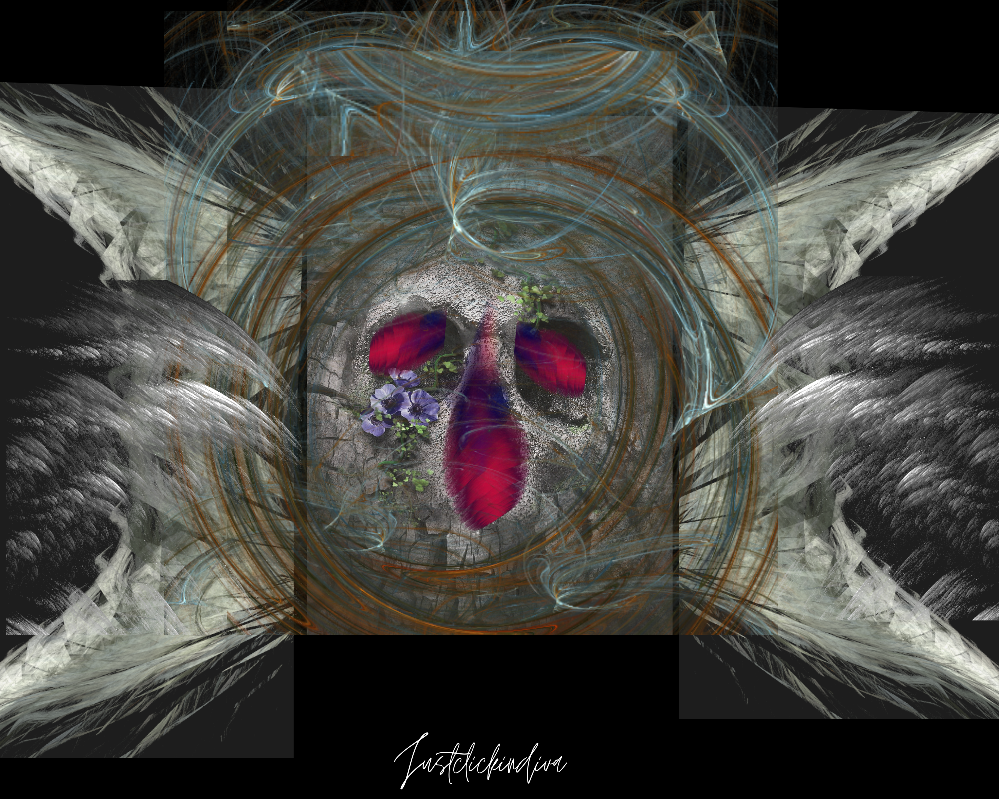 "The Skull". Printed on the back of an invitation. Why? and what is it intended to portray? A hidden message perhaps behind the blood-stained eyes and nose? Stay tuned as the answer unfolds. This haunting image of a skull is part of a digital art creation produced by me, @justclickindiva, in the Apophysis 2.09 Fractal Rendering program.