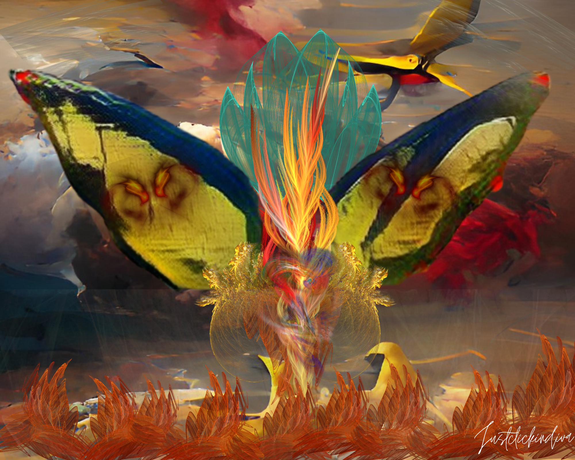 Wings Of Fire is a Fractal Art Project utilizing Apophysis 2.09. The design entails blending fractals and other generative art design program to create unique art. The blend of hues and surrealistic elements representing the sky, fire, and birds combine to create a unique dream-like representation of wings in flight.