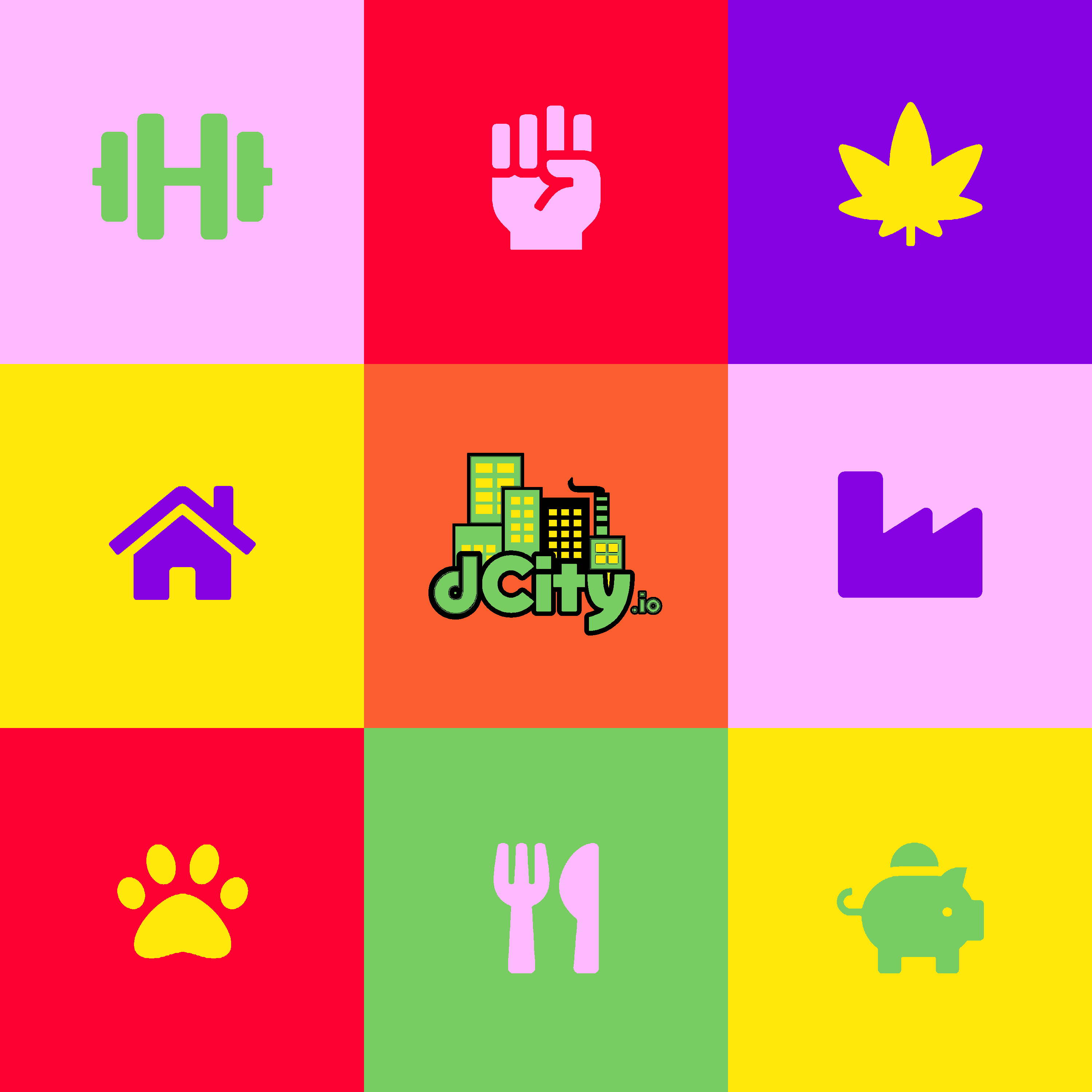 "DCity Pop Art For The Masses" is obviously inspired by Andy Warhol, but there were no GIFs in his time, fortunately or unfortunately. In DCity we attempt to please the masses by controlling crime, providing education, and training citizens. The classic icons of these various DCity 1st Edition cards were "pop-artified" for the masses, and you too can have it if you simply right click "Save image as...".