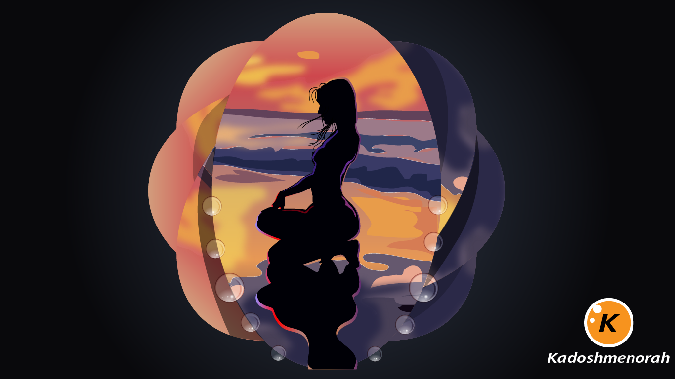 The elements of the composition are given by a colorful sky and sand, all framed in ovals that rotate superimposed to the naked figure of a girl that is adorned by pearls.