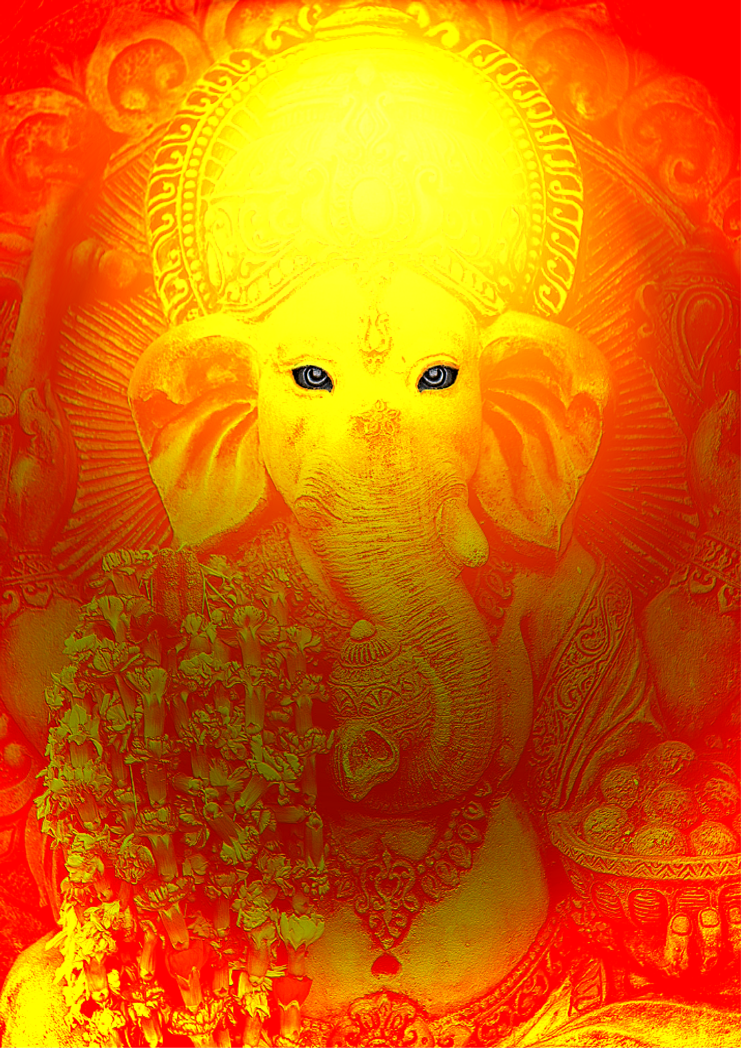 Power and radiant energy. Feel protected by the warmth of this yellow and red piece of art. The colours that stand for the sun and for fire work together here in a calming and comforting way. His eyes are looking right at you. This is a PNG 2481px x 3508px.