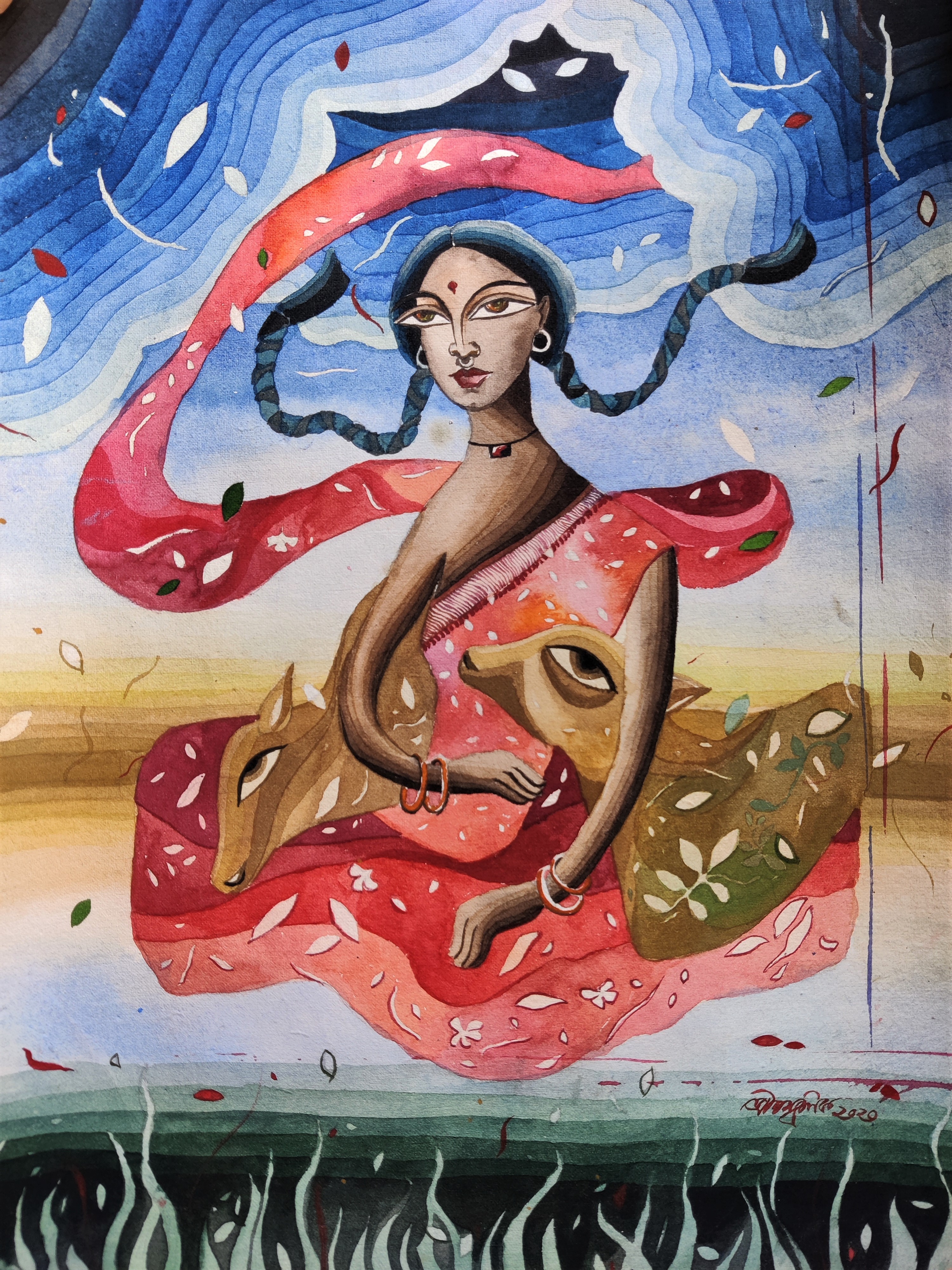 This art piece of mine is one where I have used watercolor on canvas paper. The size of the paper is 37*28 cm. With this range, the alignment of the painting is balanced as my focus was the vertical view rather than the horizontal one. Before starting a painting, it is important to map out your image and make a draft in your head. Once this phase is over, it is much easier to brush it down. The varieties of round brushes that I have used in this painting were sizes 0, 1, 5 & 8. As you can observe, different gradients of color are present, it complements the contrasting colors too. Alike, red-blue, green-black, are complementing each other. The watercolors that I have used are vivid as I have narrowed the shadows by stroking a depth to them. The process of making a satisfying painting with watercolors is all about patience and planning. Once you move step by step and align your colors according to the choice of your background it is easier to specify your ideas and guide them into perfection through your imagination. After the background is complete, the next step involves segment painting. In this phrase, each part of the painting in which different colors and designs exist is given extra attention. Each combination of color, design, outline, depth for each individual segment or part is given extra study. Finally, comes the stage of specification and final touch. In this stage, artists mainly focus on highlighting, creating depths, and giving a final touch to the painting. In my personal opinion, this segment is the satisfaction zone, when the painter is already satisfied with their painting and is about to add special details if needed.