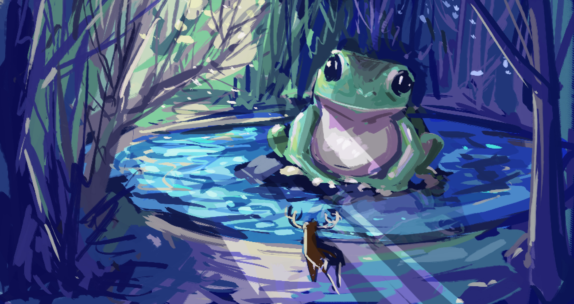 It stretched its limbs and took a deep breath, its stomach rumbling. It hadn't eaten since autumn and it was mighty hungry. Out of the bushes jumped out a deer, the giant frog observed it curiously. The deer was momentarily stunned, but it continued it gallop deeper into the forest. The frog sighed and looked around for its next meal.