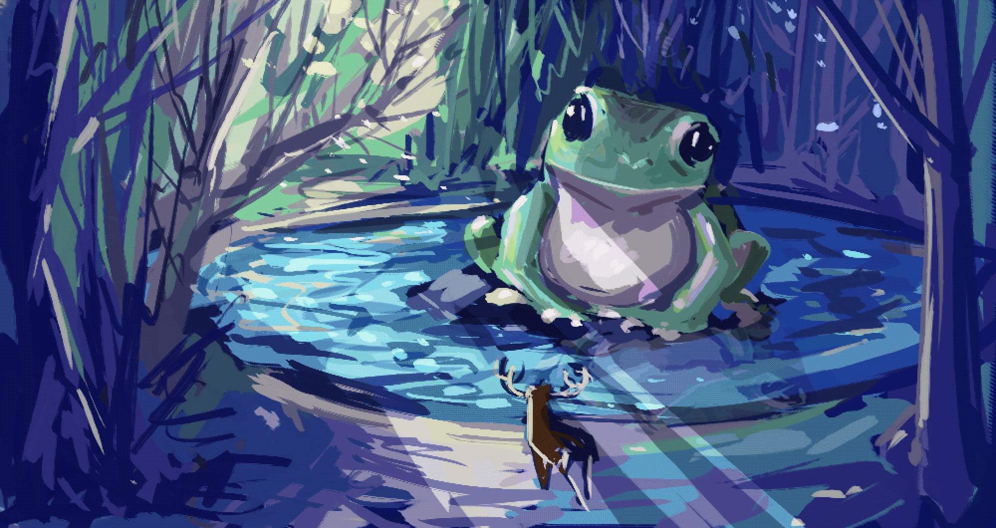 The sun was setting and the leaves and twigs danced in the wind breeze. The magic forest awoke with a start of crickets and swallows singing. The trees glowed softly with a purple tint and giant creature finally woke more it's winter slumber... It stretched its limbs and took a deep breath, its stomach rumbling. It hadn't eaten since autumn and it was mighty hungry. Out of the bushes jumped out a deer, the giant frog observed it curiously. The deer was momentarily stunned, but it continued it gallop deeper into the forest. The frog sighed and looked around for its next meal.