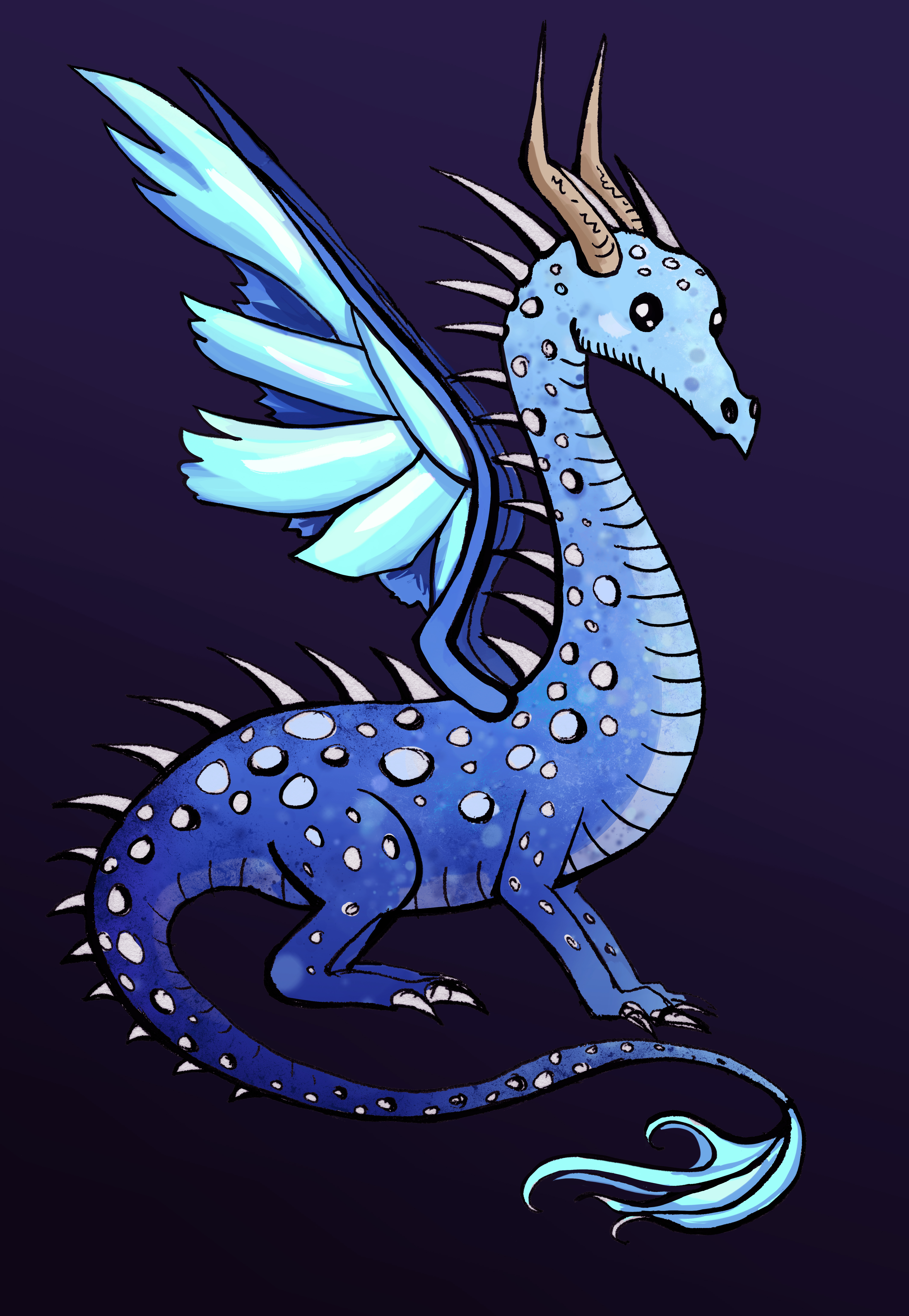 This dragon started as a dragon head concept, there is also the Lernum Head NFT. I started with the design and the outline, I used a 0.4 felt pen. I scanned the drawing and then colored the dragon digitally. To give the dragon a slight glowing effect, I used several light and dark gradients, making sure to use somewhat saturated colors. Afterwards I used a few simple texture brushes to finalize the body and clean up details. I left the wings for last because I wanted to accentuate them.