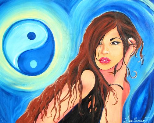 The Yin Yang symbol is present in the painting and I wanted to express a rootedness of life through love. The moon is complementary to the sun just like the man for the woman. This motion principle that I interpreted to honor the feminine side while hinting that the masculine side is just as important, despite the fact that is discreet in the painting. When a man would give the moon (donne la lune ) for a woman.