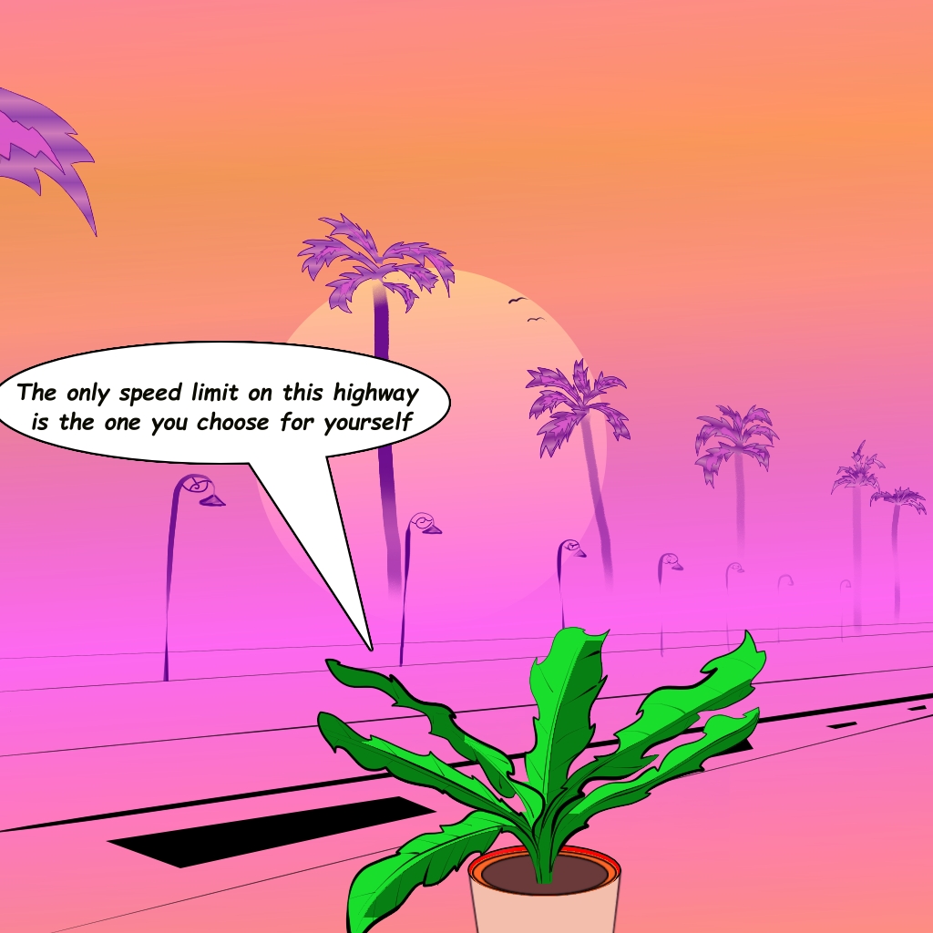 Let’s get something out of the way, yes, I’m a culantro plant. With a U. Eryngium Foetidum. Please spare me the cilantro jokes. I’ve heard them all. Who am I? That’s what I aim to find out. Oh, don’t think that the impossibility of my predicament hasn’t escaped my notice. A talking culantro plant? What gives? Yet here I am cruising down the highway on my flying self-watering pot towards some unknown destination. How did this come to pass and why? Trust me, I’m as stumped as you are. The road ahead is uncertain and fraught with peril. Where will it lead? What will I find out? As the sky fades to purple, I see the haze across the bay, and I think of a distant home in a forgotten land. ~~~ Thank you for reading the story and checking out my art. The image in this NFT is a JPEG, 1024 x 1024 px at 300 dpi.