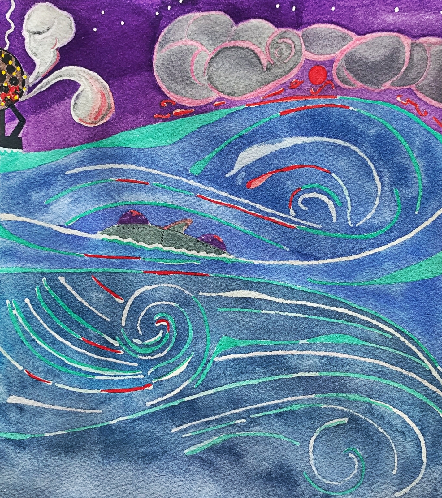Based on my episodic SciFi tale The Technologies of God, this artwork depicts the scene from episode 11. In this scene, the protagonist and his companion are inside a submersible craft, following a floating seaport in the turbulent waters of the Caribbean Sea. A "hawk" awaits them onboard to smuggle them as stowaways in a spaceship called The Orb.