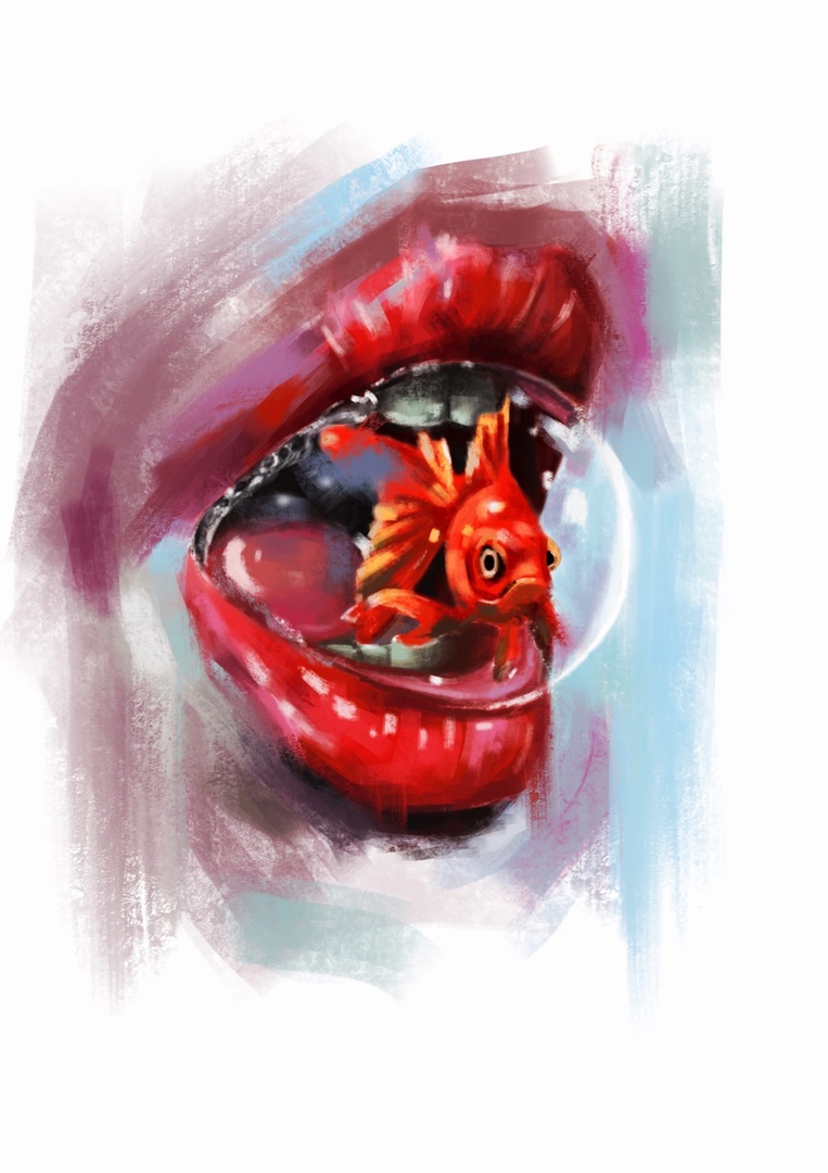 A little unusual drawing. Unusual house for goldfish in the mouth of a girl from saliva!