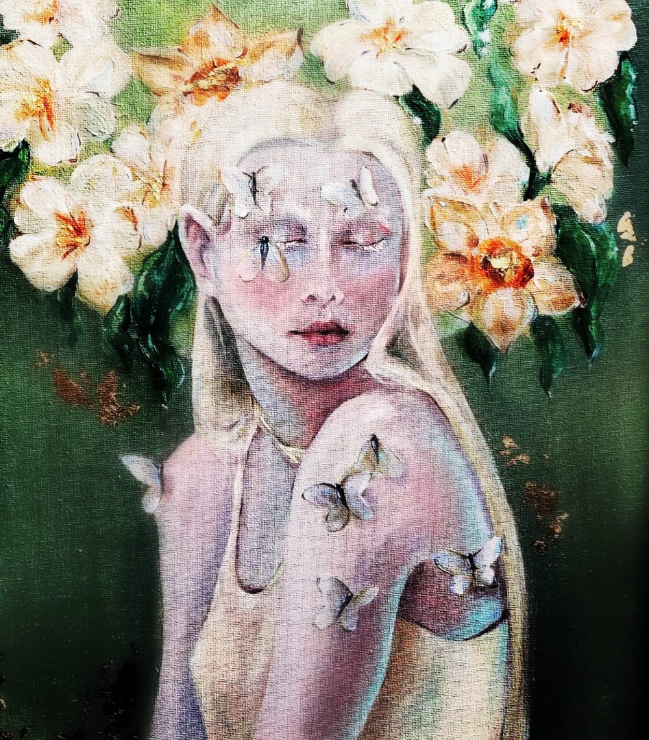 Acrylic painting on canvas! A lovely snow-white girl surrounded by insects.