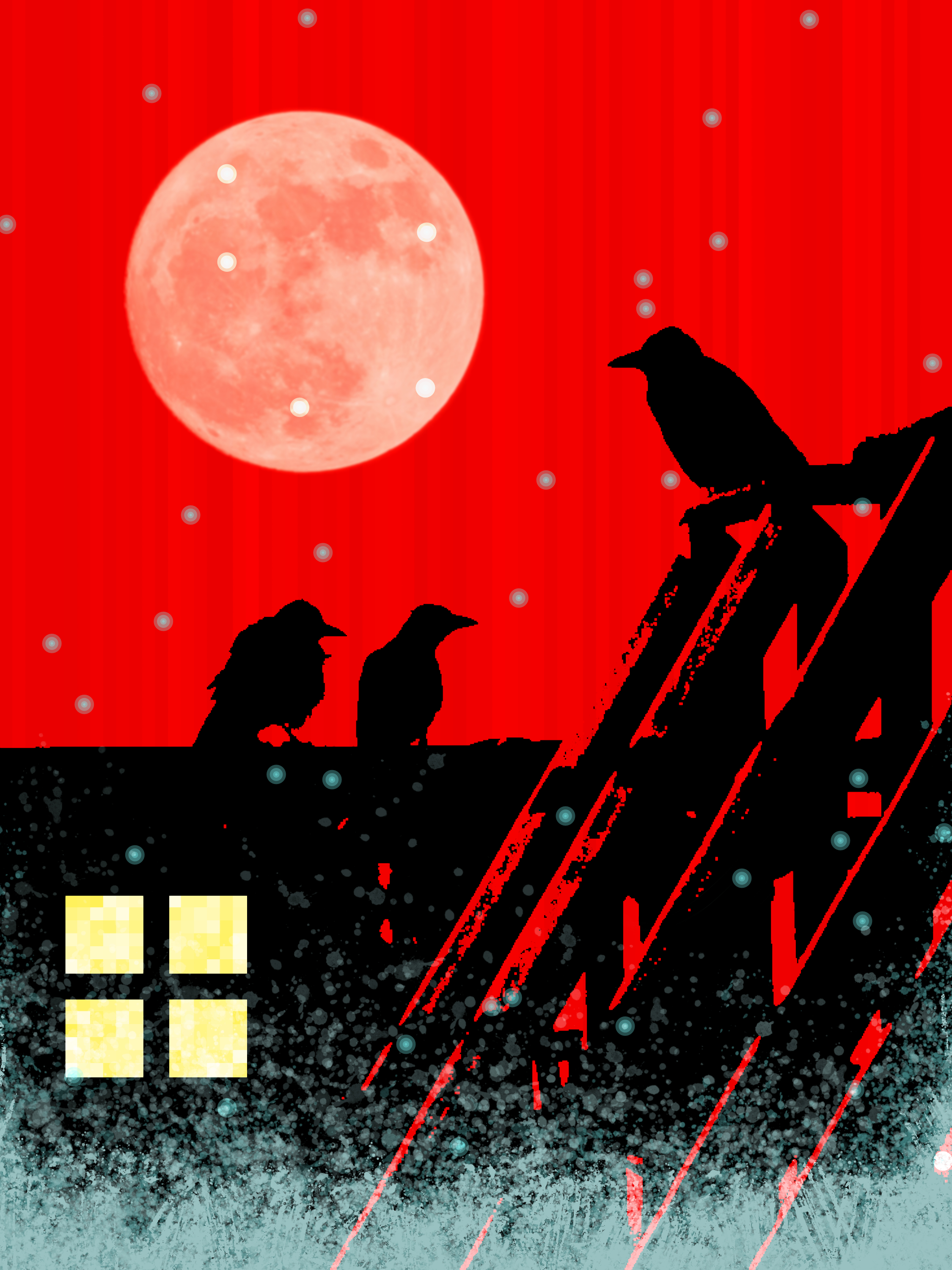 3 Crows are chatting in the snowing reddish night in the light of the full moon. The image is 2250 x 3000 pixels.