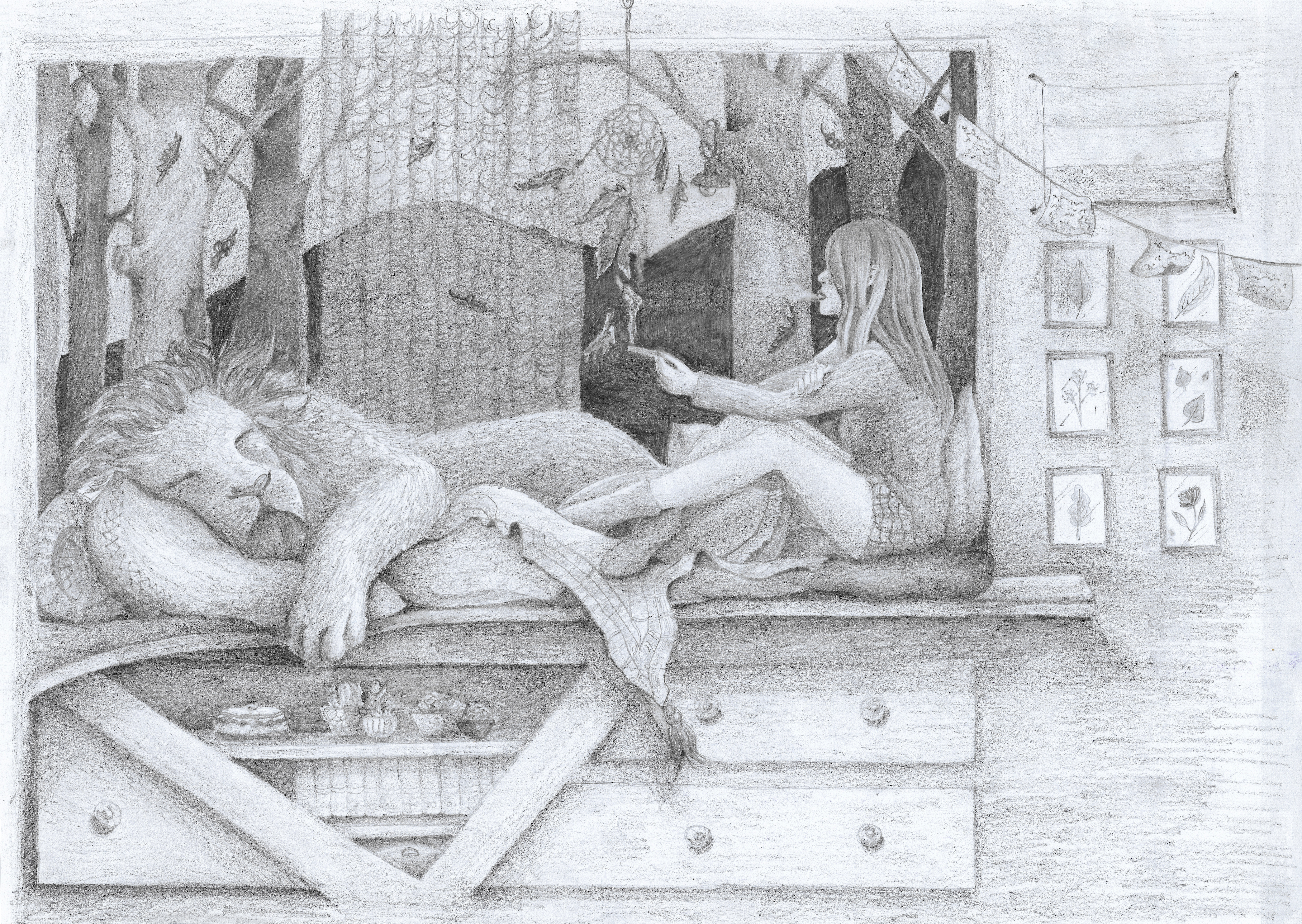 Analogue drawing created with pencil. When you are in peace with yourself, even the inner beasts can be as chilled as you are. Format: PNG Size: 4180 × 2967