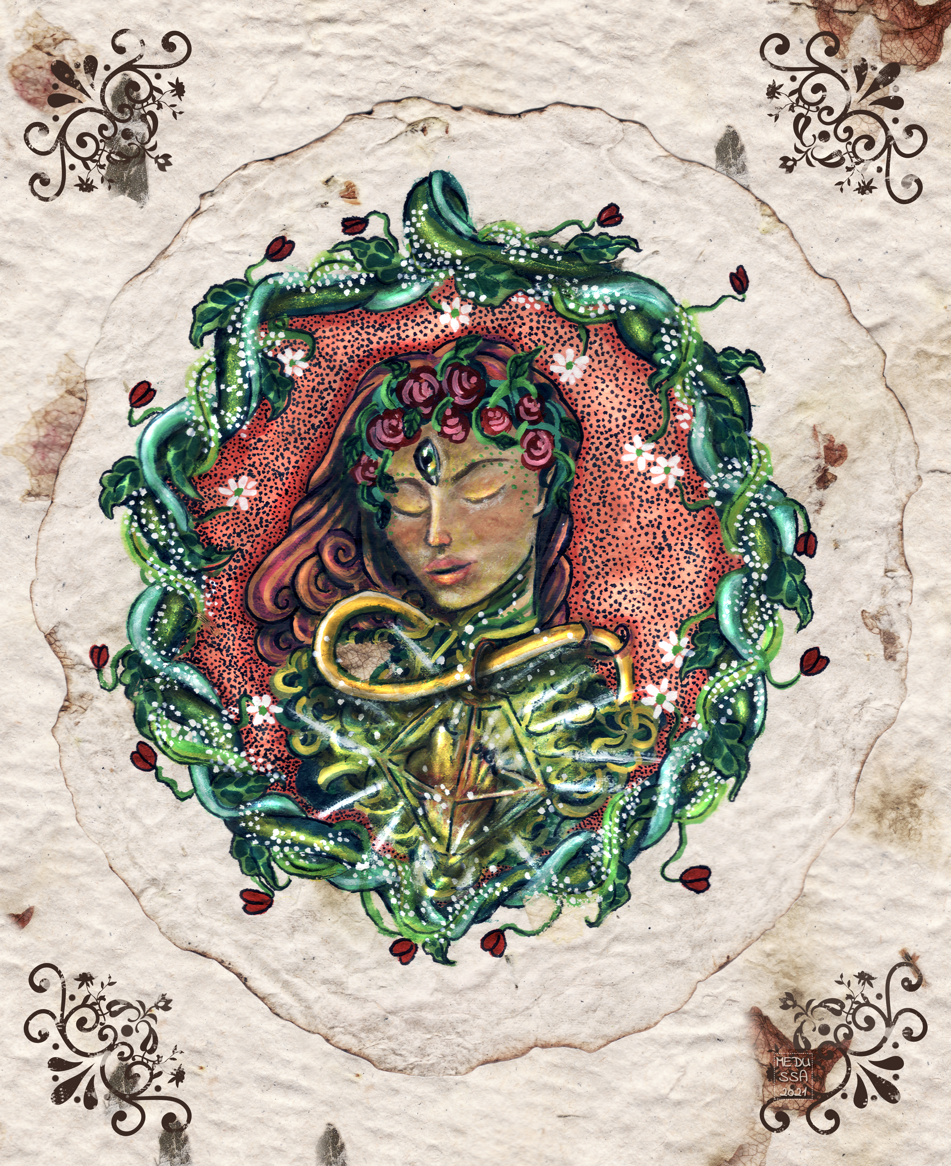 Traditional drawing on handmade paper by me .I used gouache for this special illustration.I was inspired by the energy of "The Hermit", my favorite tarot major arcane, this is like a mirror of myself finding my own wisdom, my self-love, my strength among the chaos...immersed in the deepest part of my heart.I like to paint my own oracle card as a totem when I am going through difficult times or working on my own spiritual strength to focus on my goals and not look back, not look around; sometimes we can get lost in the process of facing our own shadows or the shadows of others, but I am aligned with my purpose.You can find the process of this painting, and also the process of my handmade paper made with recycled sheets from an old book and dried flowers at my Hive.blog // https://linktr.ee/medussaart