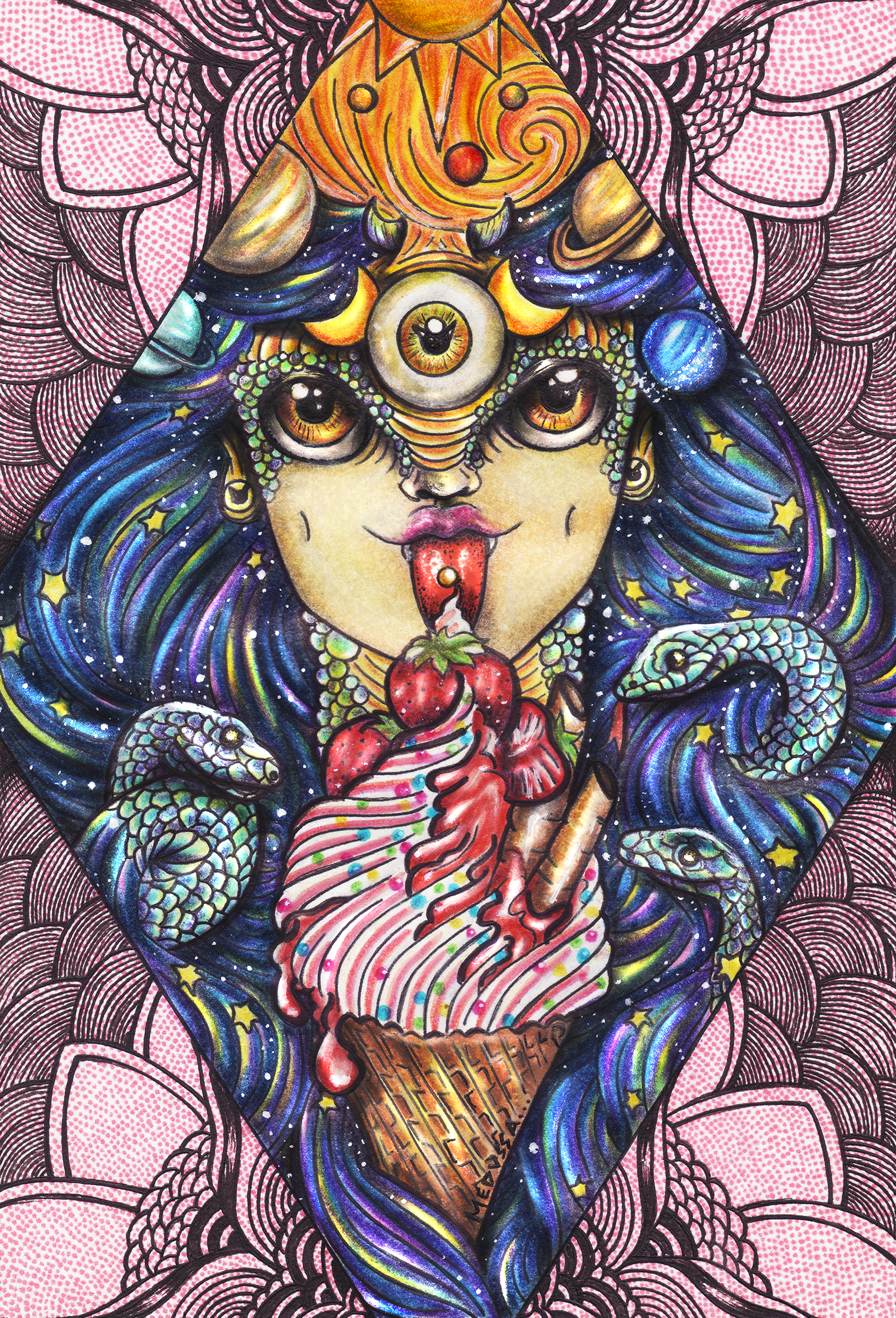 Reptilian Dream is a traditional Drawing/illustration that came out of a challenge to draw our favorite food...I am a lover of alien and cosmic creatures, I wanted to do a version of myself as a reptilian creature with a great desire to eat the food of humans, especially ice cream with strawberries. I need to eat ice cream, by the way XD.//3059x4500px /PNG FILE/