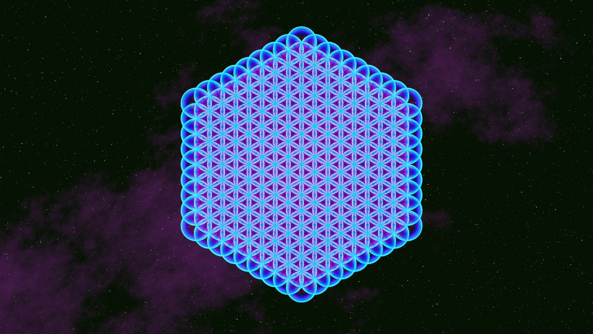This is an expression of The Flower Of Life to the power of nine, referencing Nikola Tesla's "Secret of the universe" the 3, 6 & 9). The Flower of Life is pink and Blue, it sits in a space setting with faint nebula in the background.