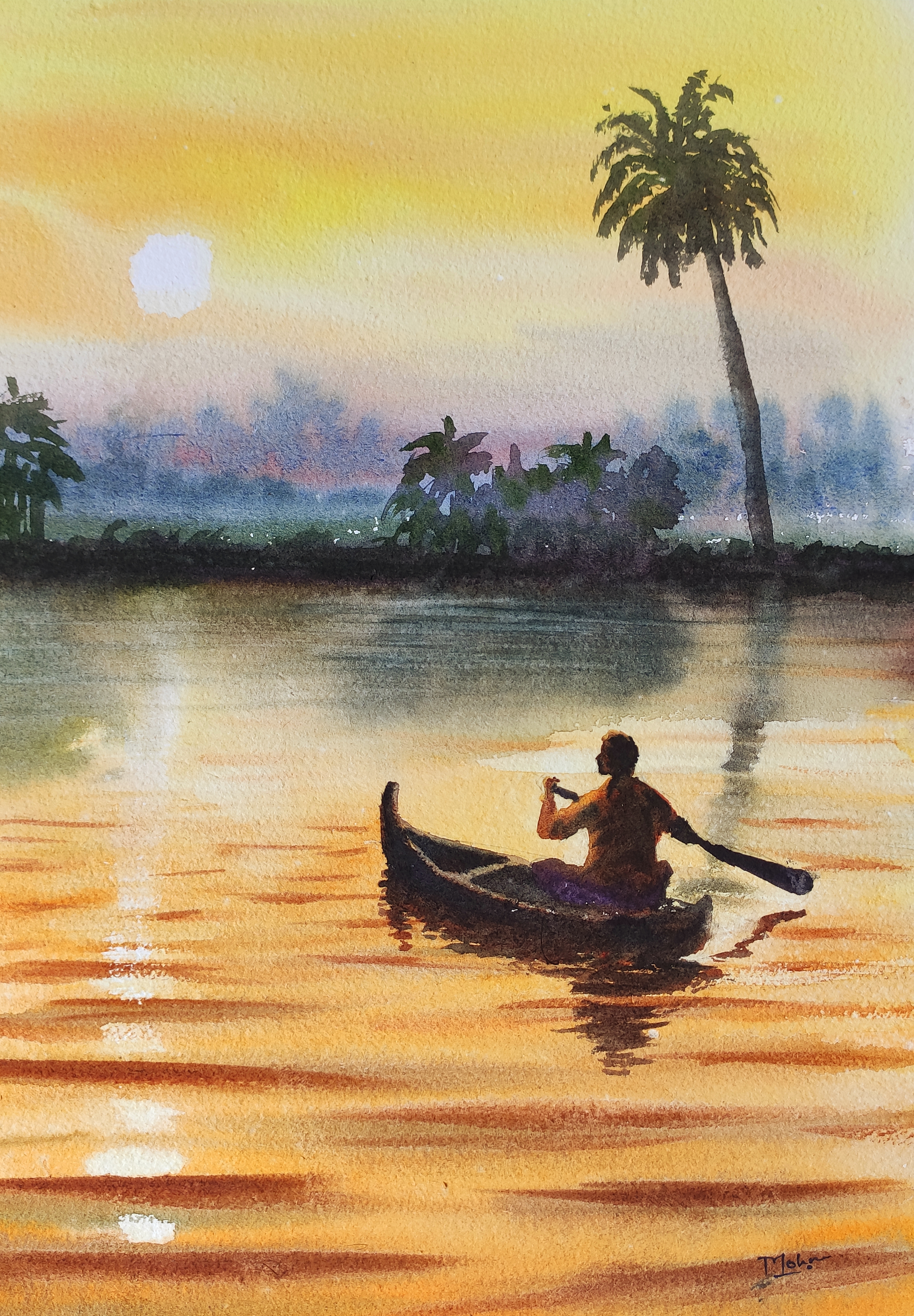 Watercolor painting on paper of boatman rowing in sunset