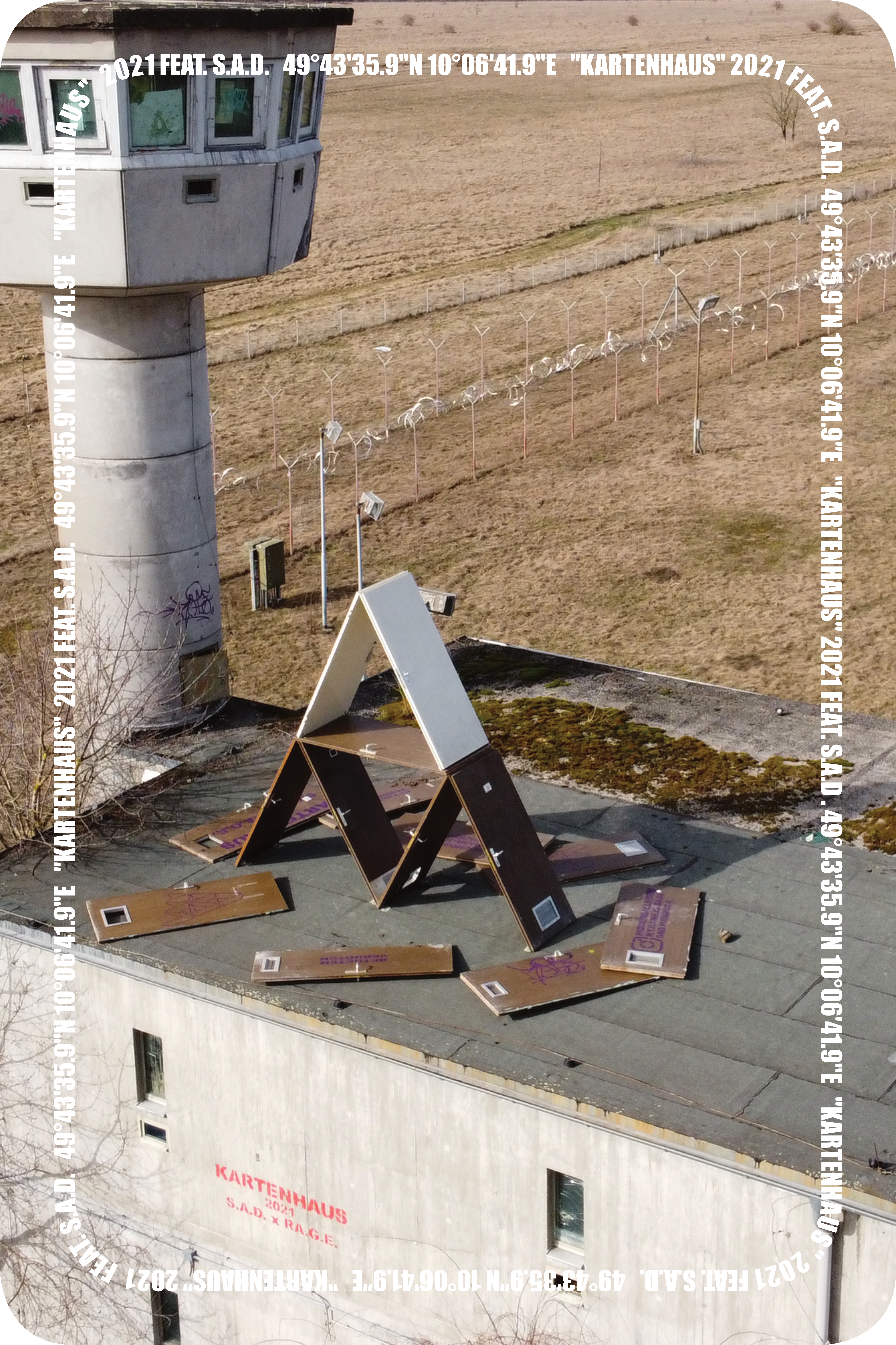 A HOUSE OF CARDS MADE OUT OF DOORS BUILD ON THE ROOF OF AN OLD U.S. BARRACK IN GERMANY. | 49°43'35.9"N 10°06'41.9"E | MORE INFORMATION ON: INSTAGRAM: @my.name.is.rage / @hiddengalleries WEB: https://www.rage-art.de/kartenhaus/ | (VERSION 2)