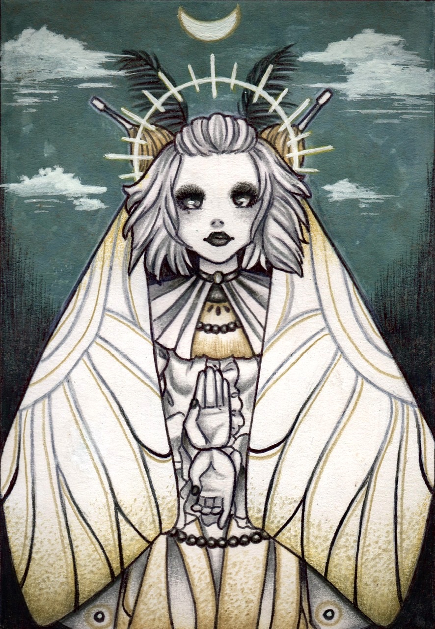 One of my favorite oracles or tiny drawings. Traditional painting made with mixed technique// JPEG FILE// 2.182x.3154// You can see the process by following this link to my hive blog: https://peakd.com/hive-158694/@nemiteme/moth-lady-mixed-technique-dama-polilla-tecnica-mixta