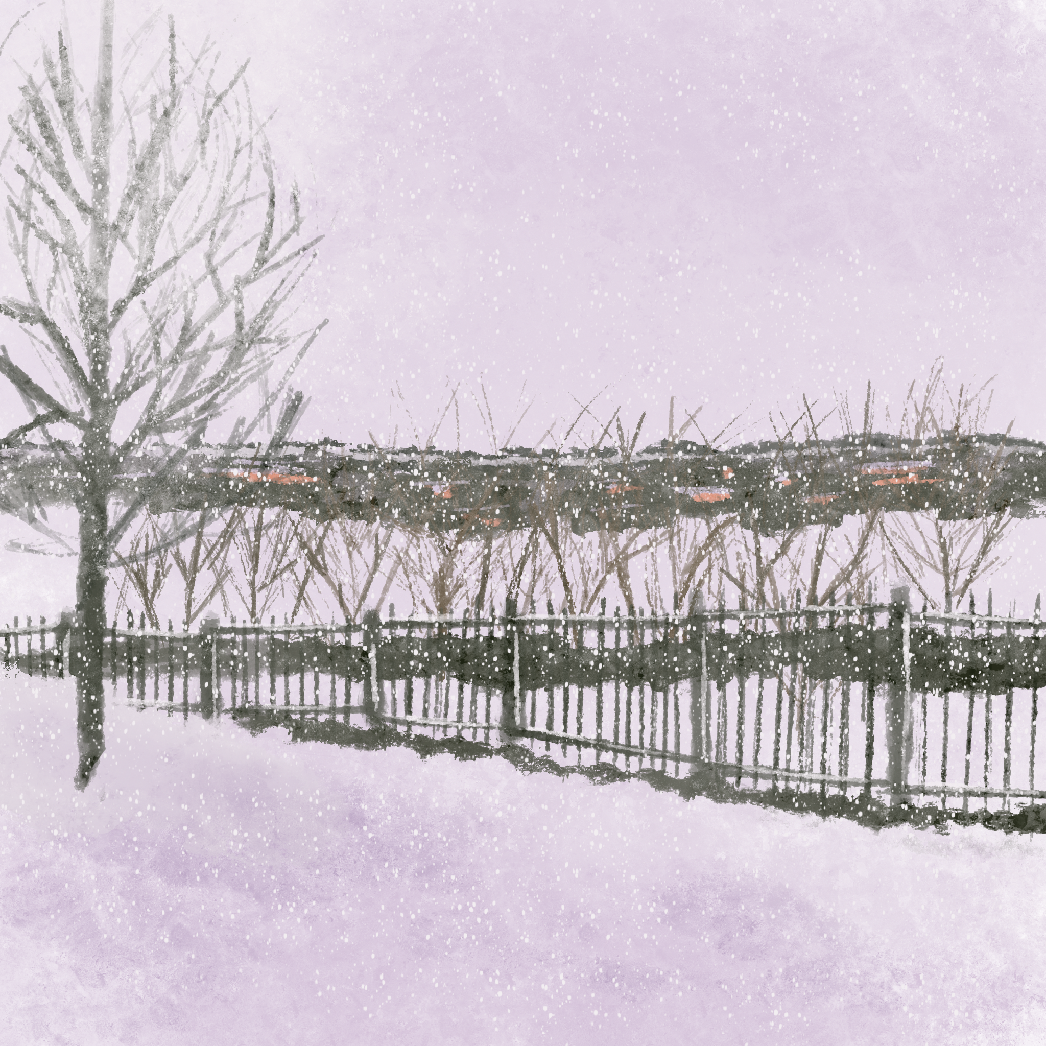 A simple painting of a special time and event where snow falls during a sunset. In order for this to occur, for the light to be right, the clouds need to be somewhat thin, allowing the setting sun to emanate through the moisture. It must be relatively warm (30-36F) for the snow to fall rather large; chunky. It's slightly foggy out. You likely feel damp and can feel the clouds, the moisture, in your lungs and on your skin. Though cold and desolate, but you can't help but feel a warmness to your soul. A warmness the feeling of nostalgia creates, a longing for good times of the past; but also a hopeful glimpse into the future, one that vibrant, green, and one which is worth enduring.