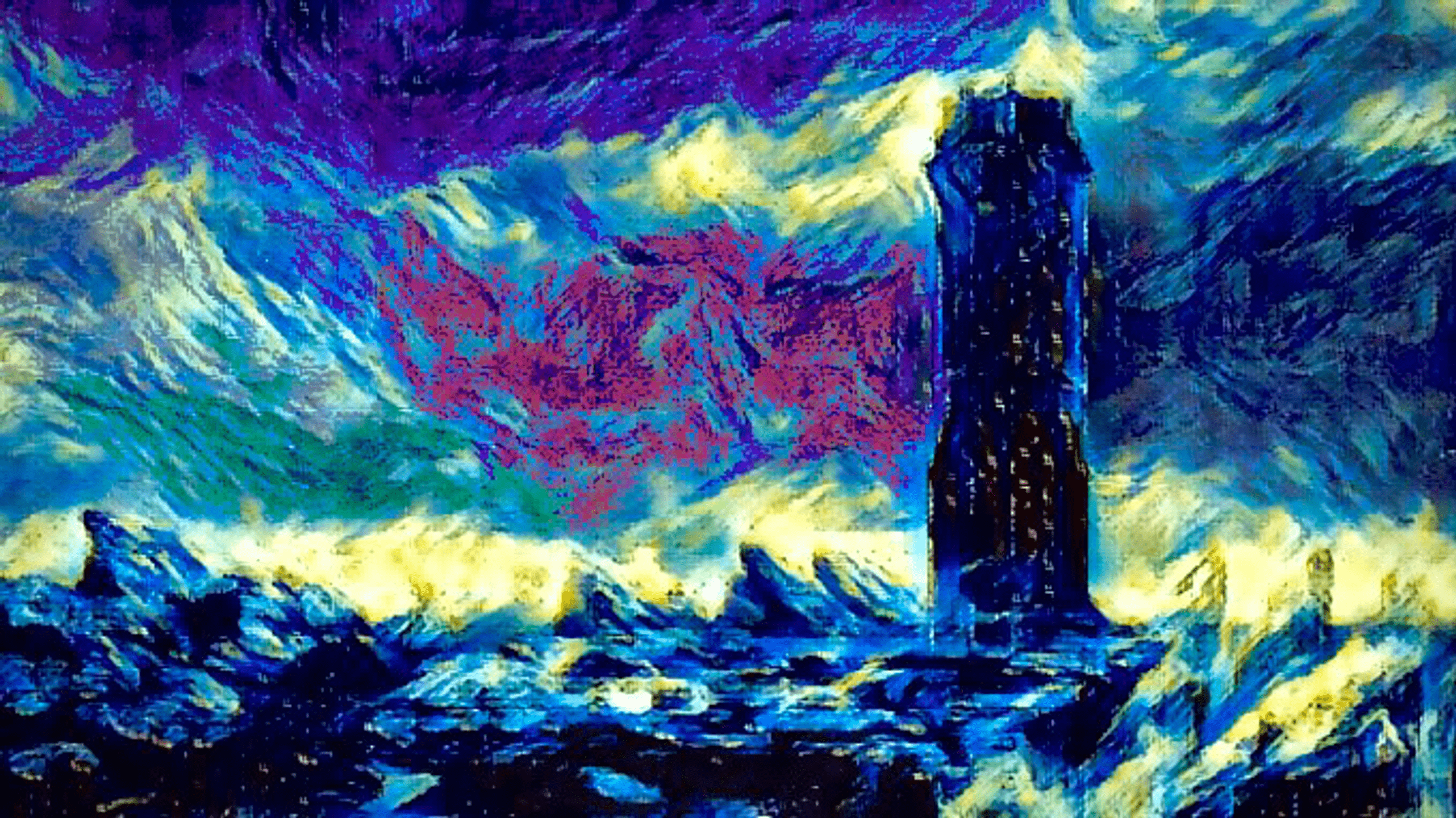"Sky's churning colors. Seems it's going to rain. Really Odd. The tower darkens over the cliffs. Winds from the north, blowing the ocean into it"