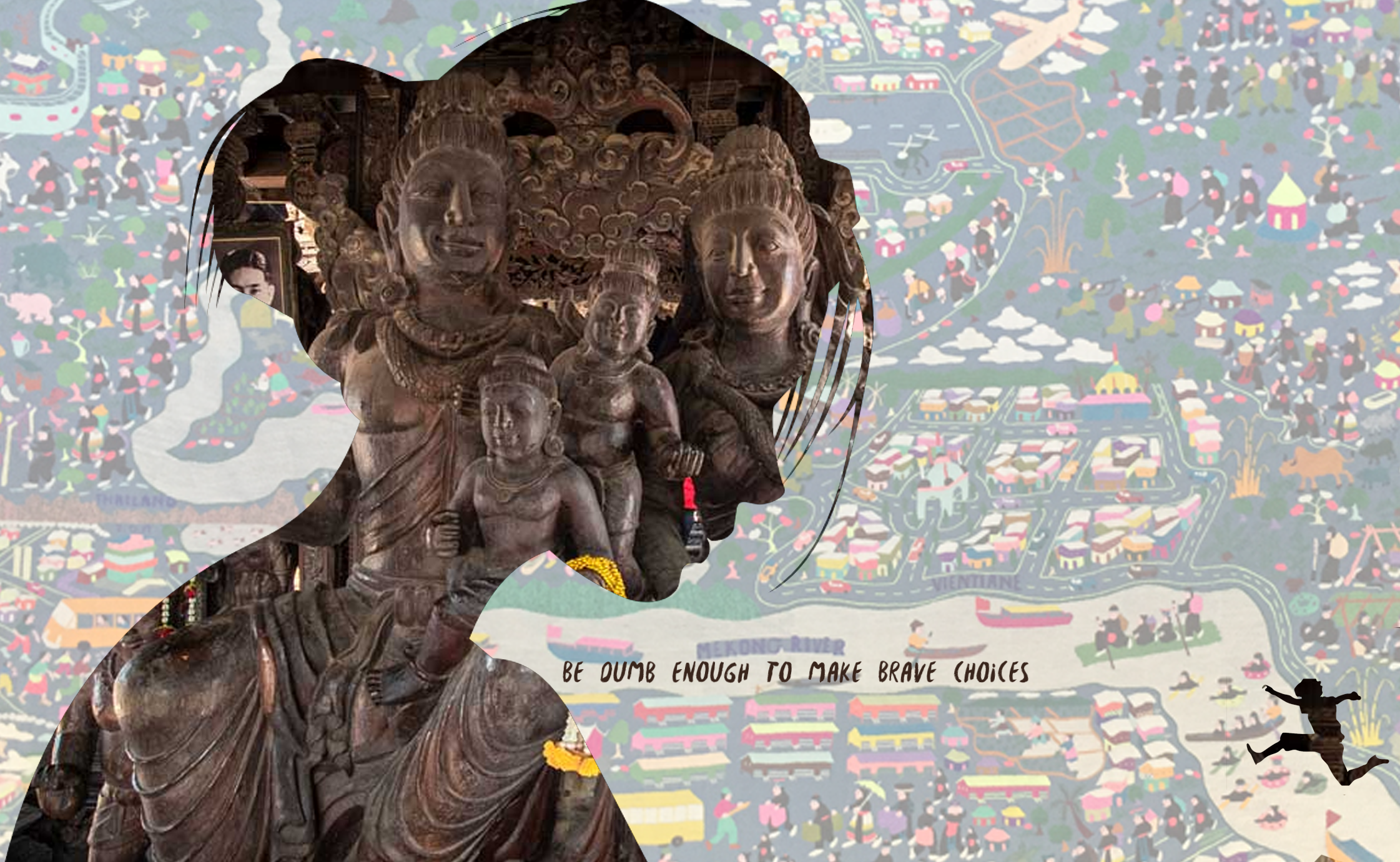 Digital collage including an image from the Sanctuary of Truth representing the importance of parental love and wisdom, a Lao story cloth, and a silhouette of a small boy.
