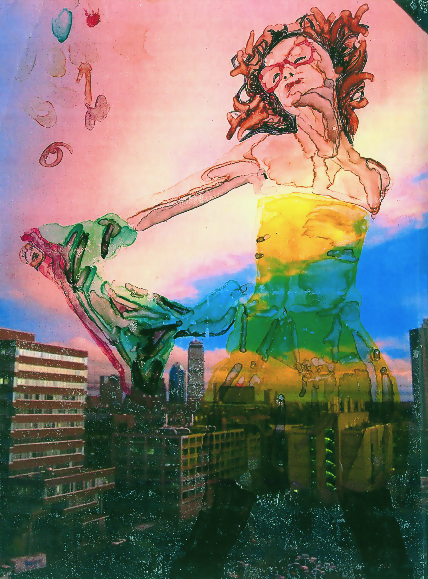 Created in 2007, updated in 2021. When I first moved to NYC, I finally felt free to be myself. A few months later I saw a girl at a student fashion show who was walking down the runway with the same expression I imagine I had when walking down the street along Central Park at night: joy, freedom, confidence. I drew her likeness with illustration markers and then used a glue transfer technique to add it to this image of NYC. It's been recently scanned and digitized so I could bring it to hive.