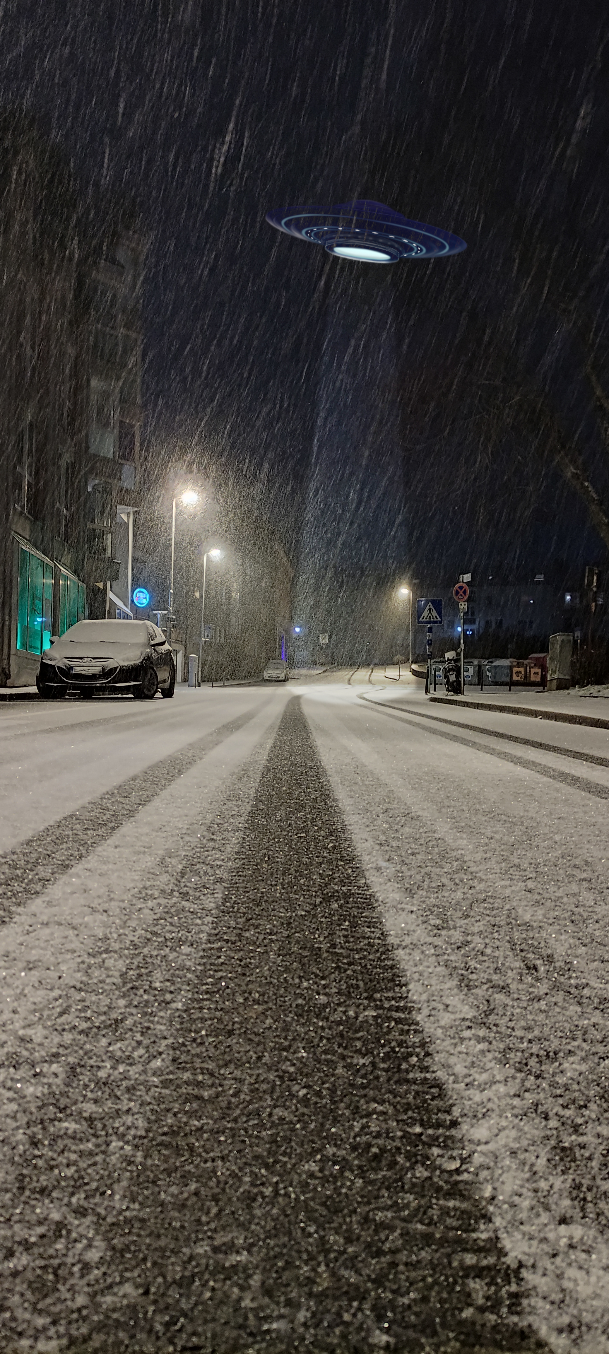 This is a photograph taken in the city I’m living in. I haven't seen this much snow since childhood. I added an UFO to the photo to combine photography and drawing. It’s my first experiment in that field. (Format: PNG, Size: 12.6 MB, Dimensions: 2080 x 4624)