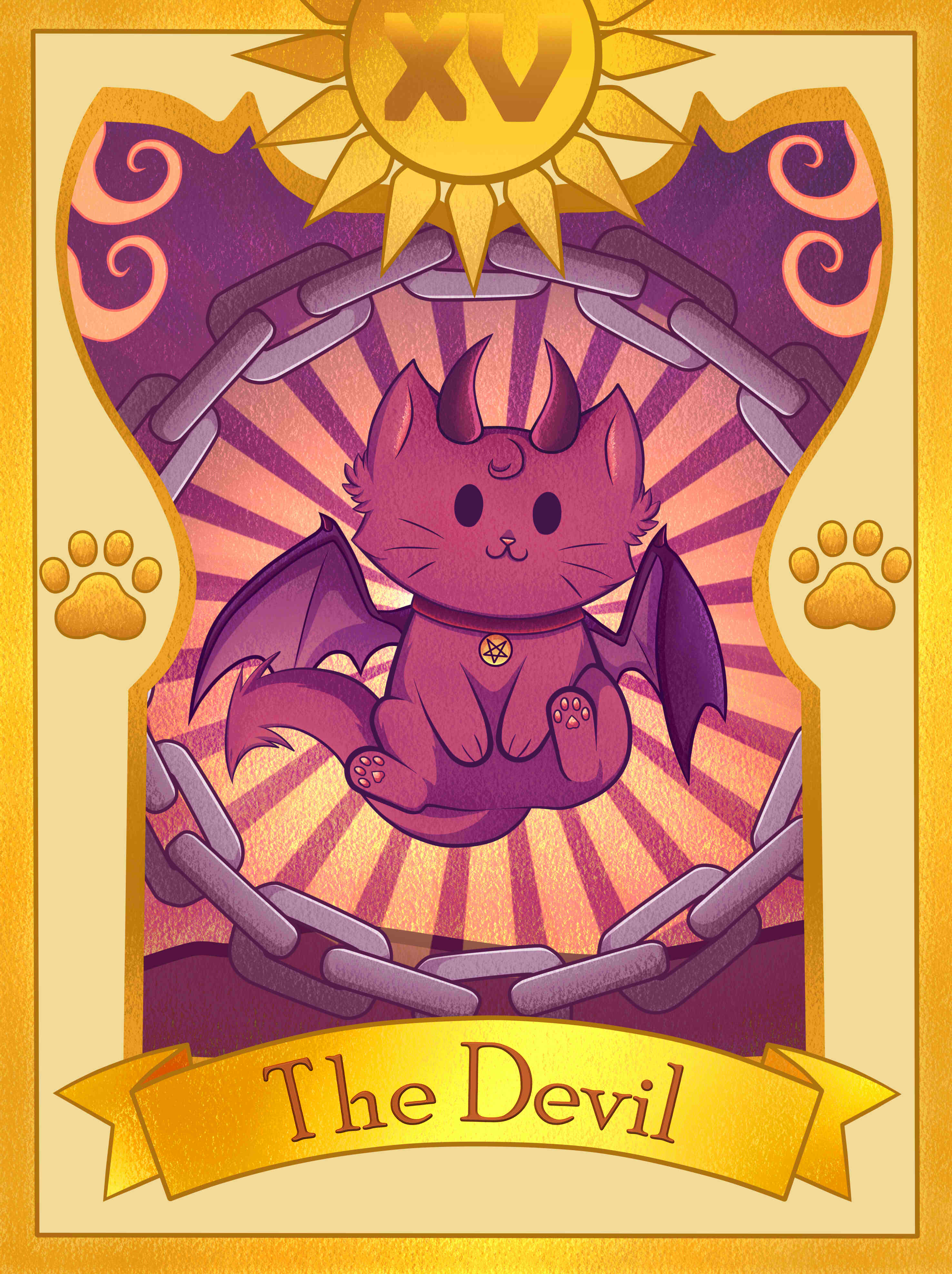 The Devil card shows Baphomet, who represents the balance between good and evil, male and female, and human and animal. The Devil has the wings of a vampire bat, an animal that sucks the lifeblood out of its prey, symbolic of what happens when you give in to your raw desires. He has a hypnotic stare which ‘magnetises’ and entrances those who come near him, bringing them under his power. On his neck is an inverted pentagram – a sign of the darker side of magic and occultism.
