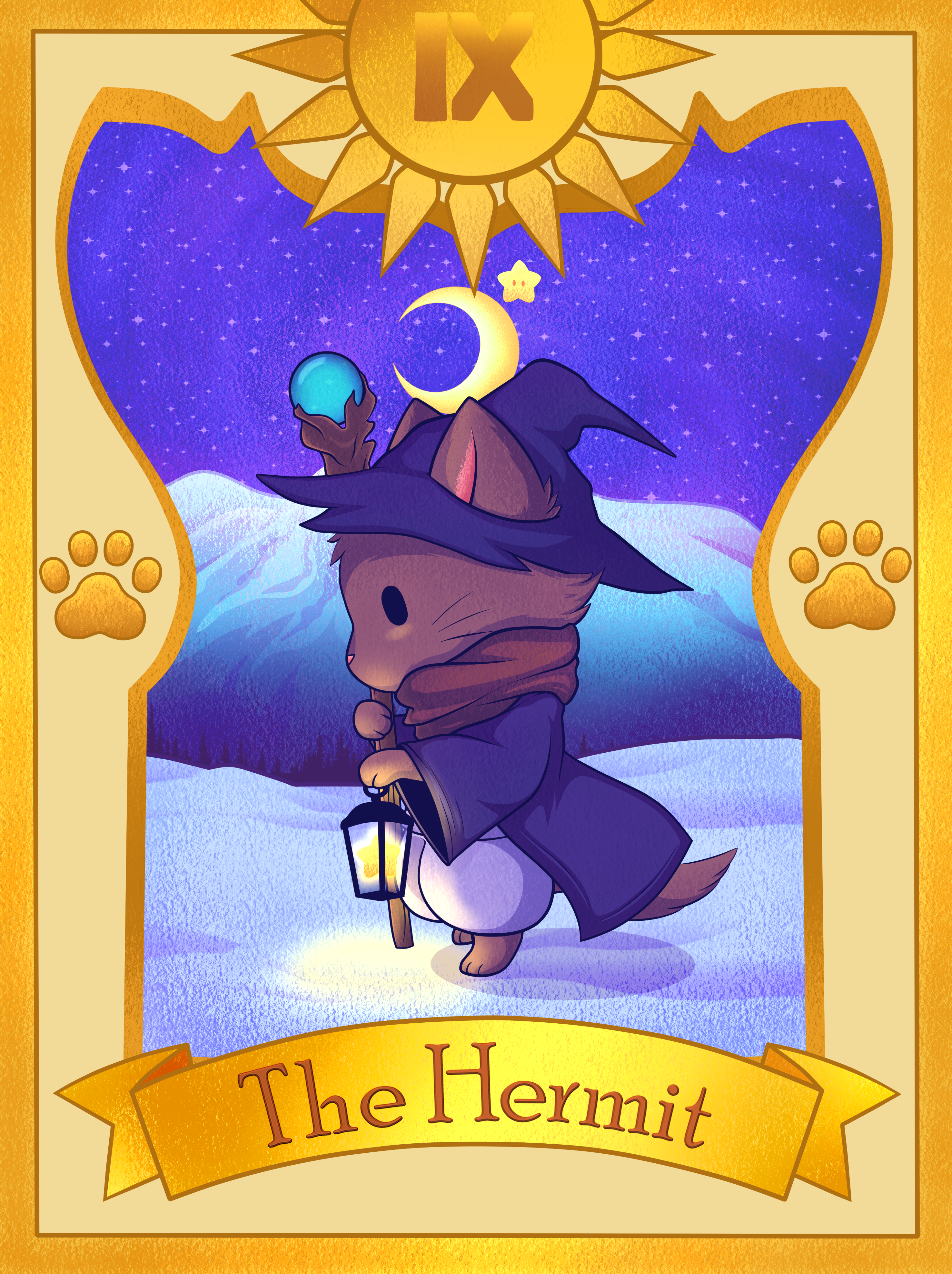 The Hermit stands alone in a snowy place, which symbolises his spiritual mastery, growth and accomplishment. He has chosen this path of self-discovery and, as a result, has reached a heightened state of awareness. In one hand, he holds a lantern with a star inside; it is the Seal of Solomon, a symbol of wisdom. As the Hermit walks his path, the lamp lights his way – but it only illuminates his next few steps rather than the full journey. He must step forward to see where to go next, knowing that not everything will be revealed at once. In his other hand, the Hermit holds a long staff (a sign of his power and authority), which he uses to guide and balance him.