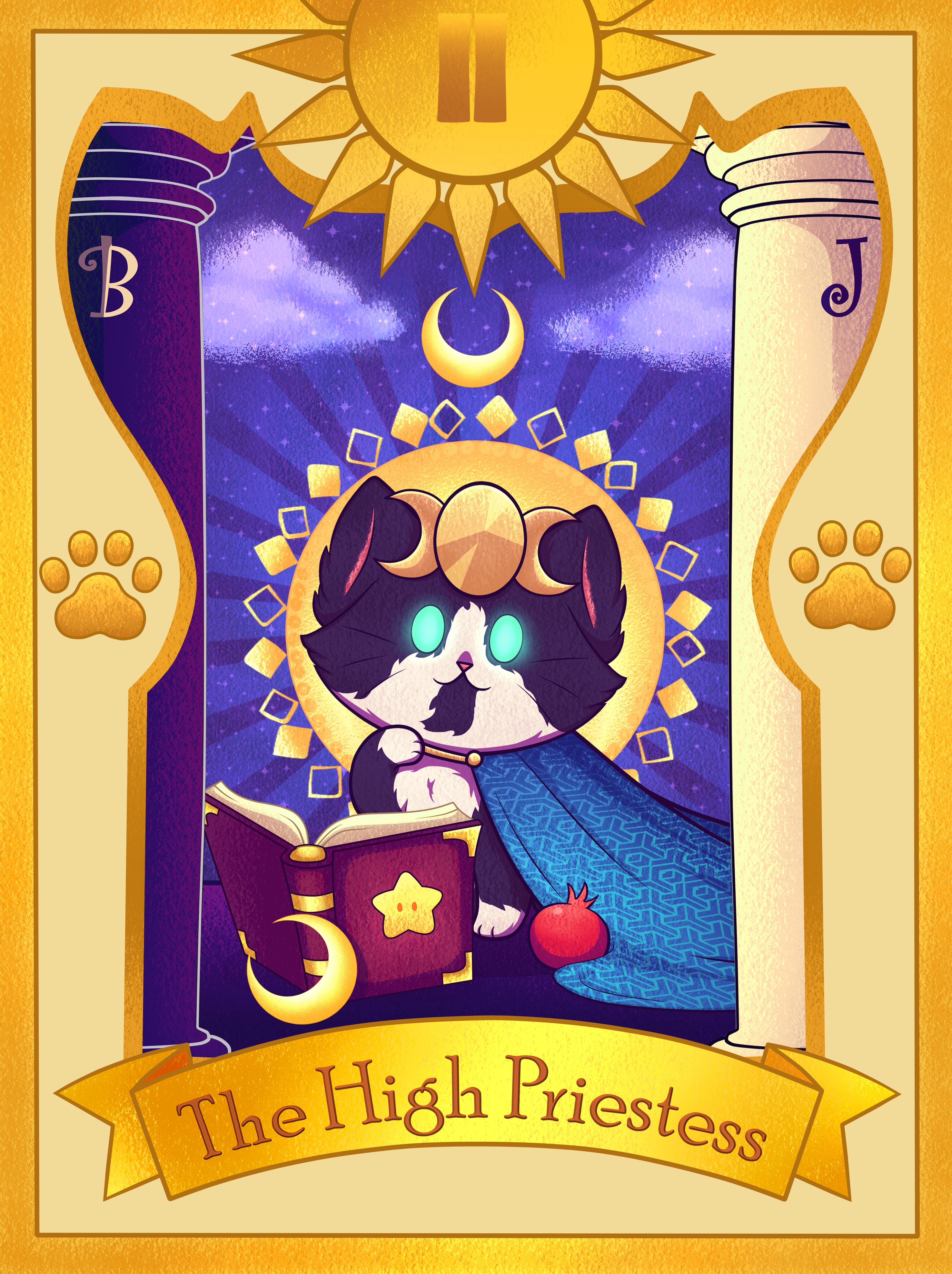 On either side of the High Priestess stand two pillars, marking the entrance to this sacred, mystical temple. One pillar is black with the letter B (Boaz, meaning ‘in his strength’) and the other is white with the letter J (Jachin, meaning ‘he will establish’). The black and white colours of the pillars symbolise duality – masculine and feminine, darkness and light – stating that knowledge and acceptance of duality are required to enter this sacred space. The High Priestess wears a blue robe and a horned crown, both a symbol of her divine knowledge and her status as a divine ruler. She has a book and a crescent moon at her paws, that symbolises her connection with the divine feminine, her intuition and subconscious mind, and the natural cycles of the moon. The pomegranate is a symbol of abundance and fertility.