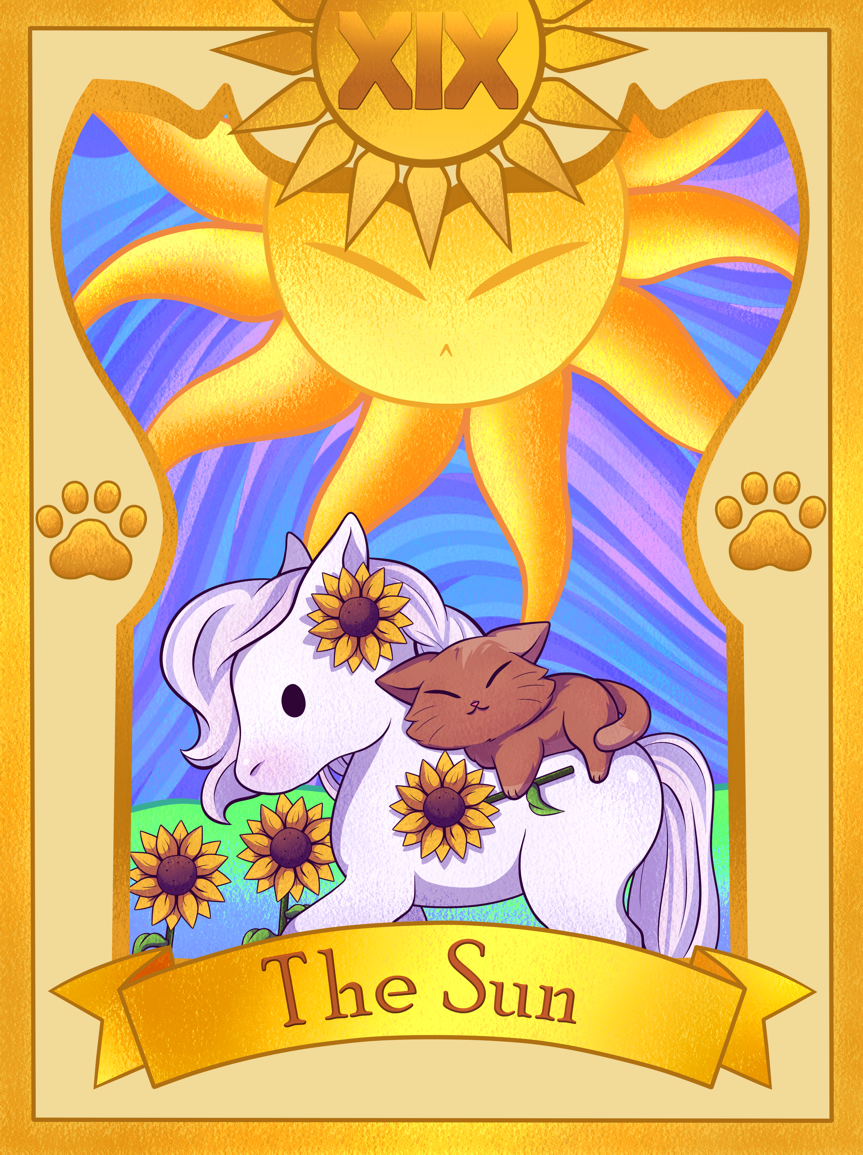 The Sun Tarot card radiates with optimism and positivity. A large, bright sun shines in the sky, representing the source of all life on Earth. Underneath, four sunflowers, representing the four elements. In the foreground, a young, naked kitten is sitting on top of a calm white horse. The kitten represents the joy of being connected with your inner spirit, and his nakedness is a sign he has nothing to hide and has all the innocence and purity of childhood. The white horse is also a sign of purity and strength.