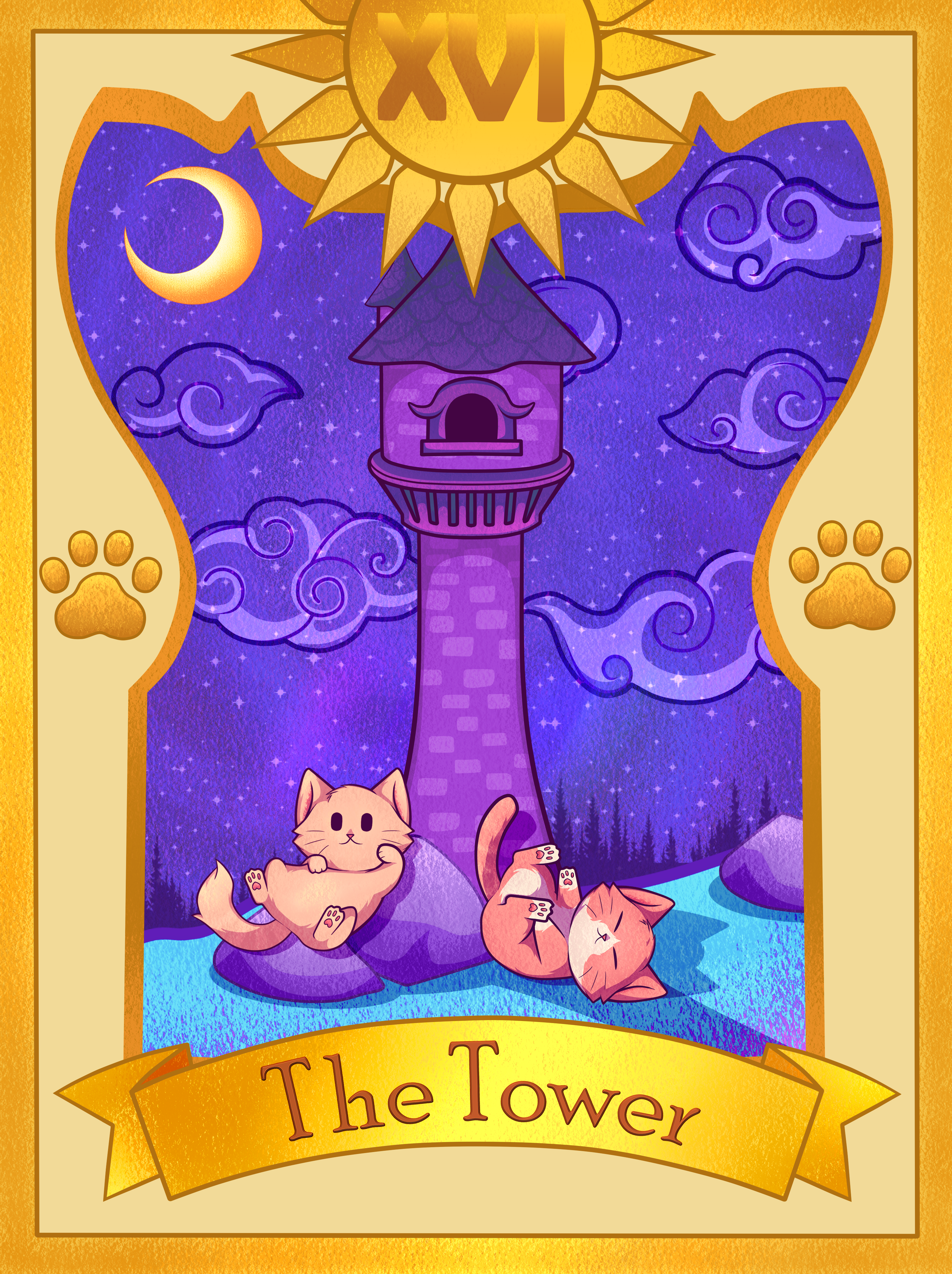 The Tower shows a tall tower perched on the top of a rocky mountain. Two kitties falls after attempting to climb. It is a scene of chaos. The Tower itself is a solid structure, but because it has been built on shaky foundations, it only takes one bolt of lightning to bring it down. It represents ambitions and goals made on false premises.