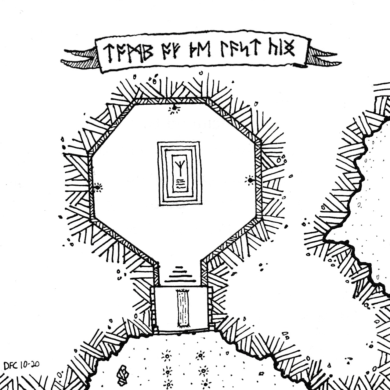 The Tomb itself is cut into the rock of a secluded cave system, with many winding twists and tight passages. The cavern side of the tomb is an open cavern, with six simple torches set to create a path to the large twin black walnut doors. Heavy chains criss-cross the entrance, with a single large lock.