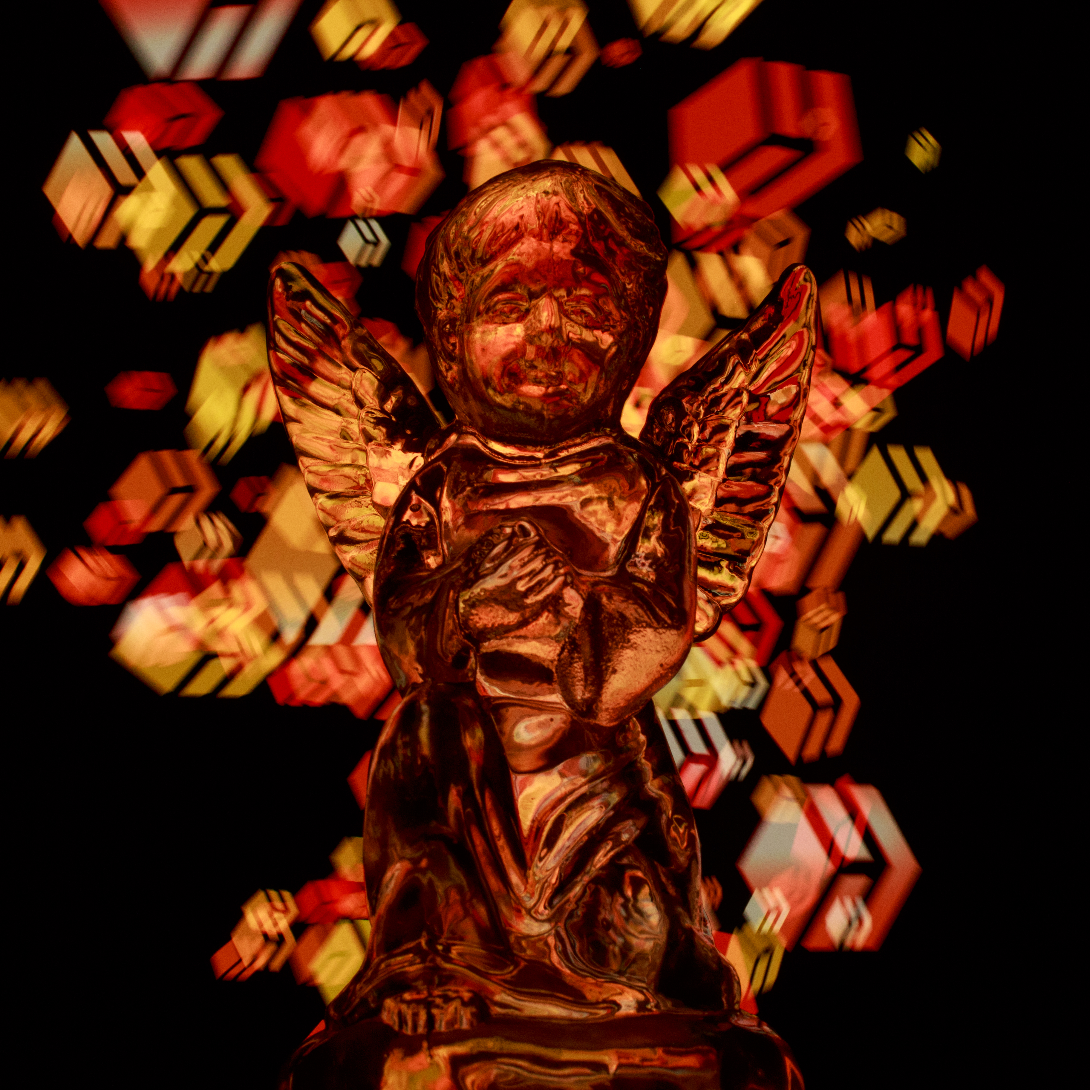 I created this photo by playing an animation I made of strobing Hive logo particles on my mobile behind a glass angel during a long exposure. Included in the unlockable files is the animation that made this. You can play it on your mobile to sprinkle Hive logos on your light paintings.