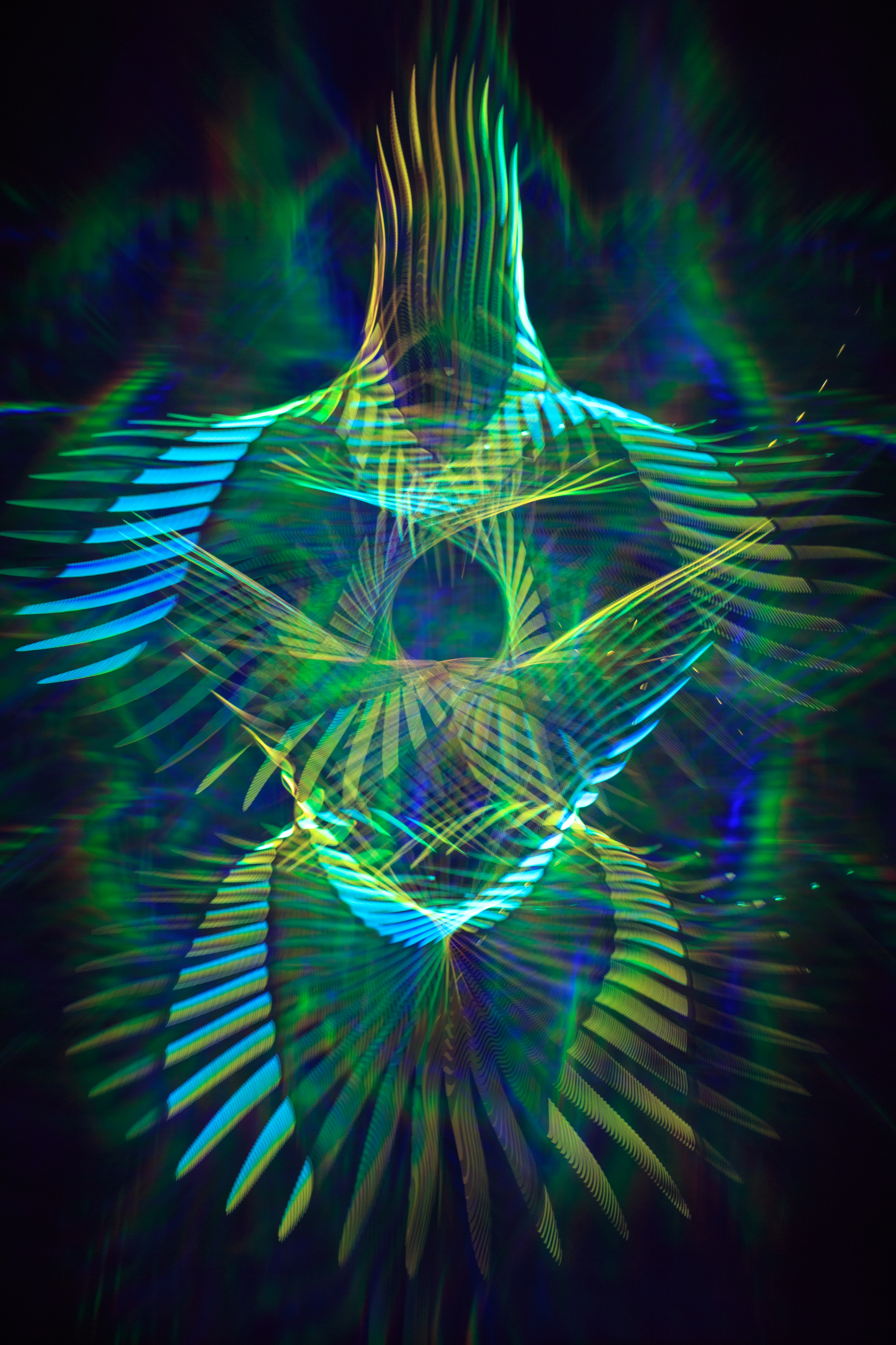 As my first tokenized art ever I present to you Positronic Man. This is a long exposure photo of an animation I made playing on a 4K monitor. I developed a process of making 3D animations specifically for light painting and the Synthetic Lifeforms series is a prime example of this technique in action. While the animation is playing, the camera is moving slowly on on a motorized mount. I opportunely add diffraction grating in front of the lens for the RGB glow.