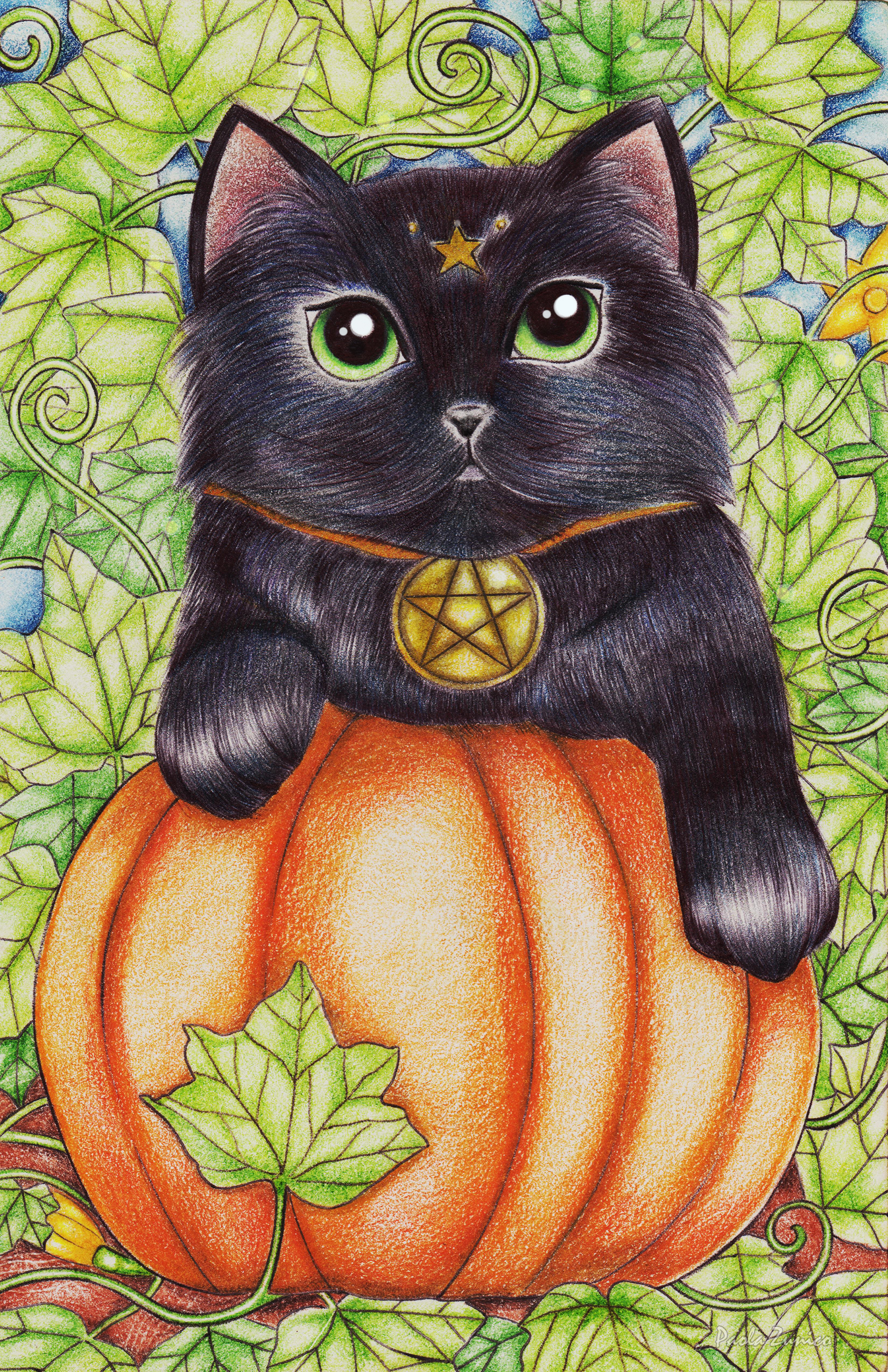 The black cat, the pentacle and the pumpkin are part of the magical symbols of ancient cultures. In this piece I wanted to highlight all those elements as a whole to remember that life is full of magic, you just have to believe in it.
