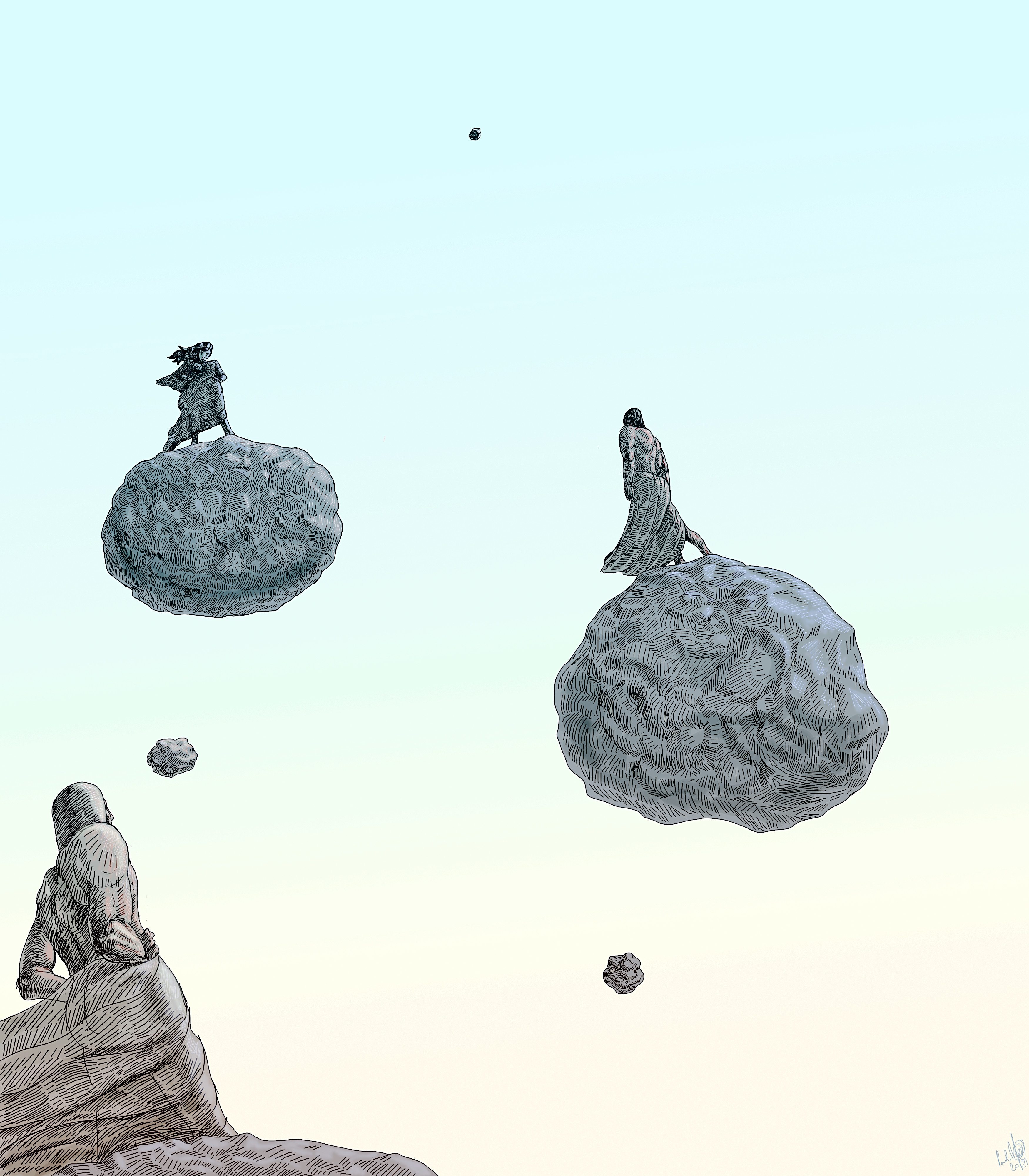 Original digital drawing made using Gimp and Wacom Intuos Pro. Two men and a woman on floating asteroids