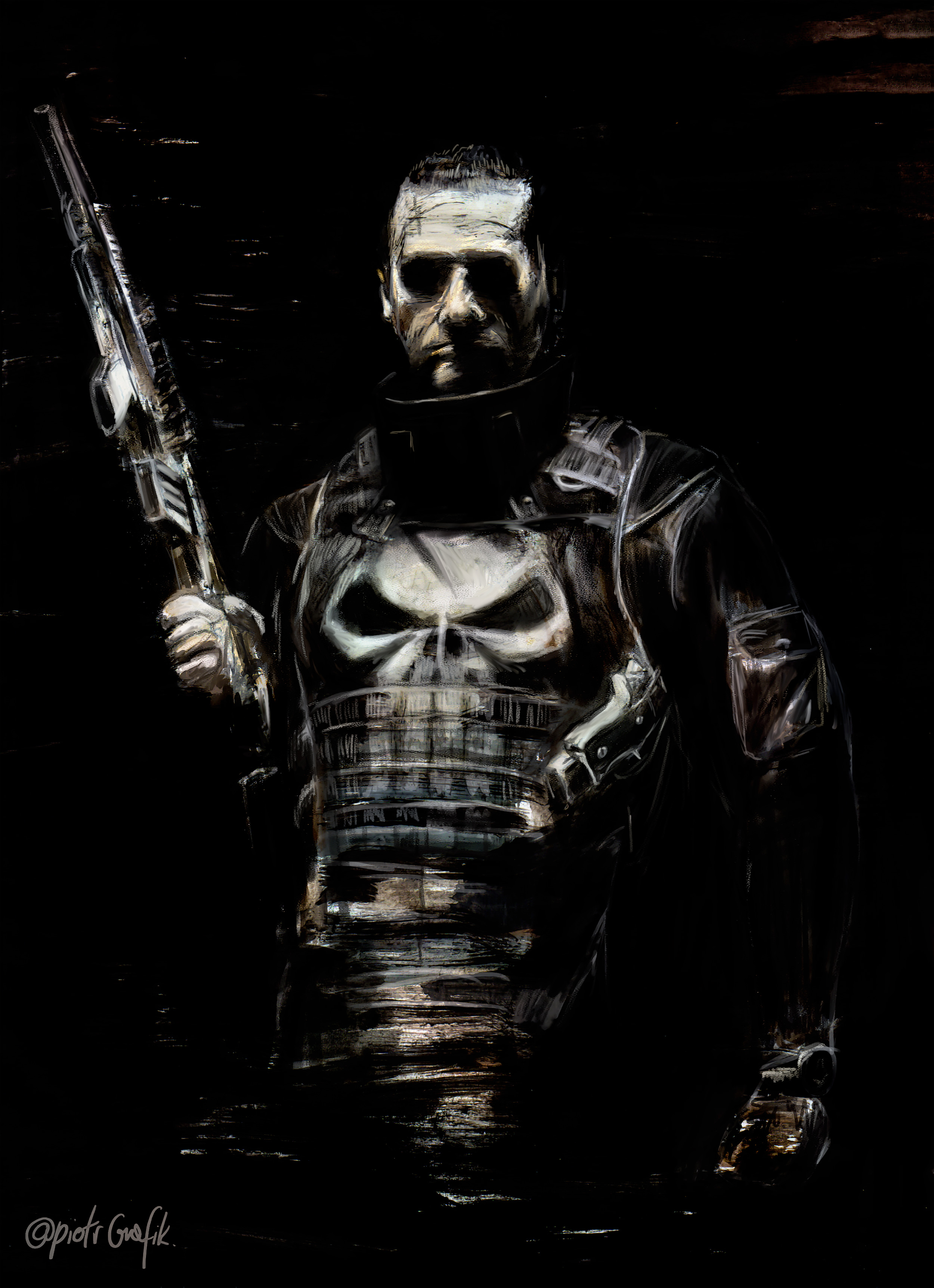 This is my rendition of poster from movie "Punisher: War Zone" Started as a simple painting and then enhanced with Photoshop. This is the final version with a 2500x3446 resolution.