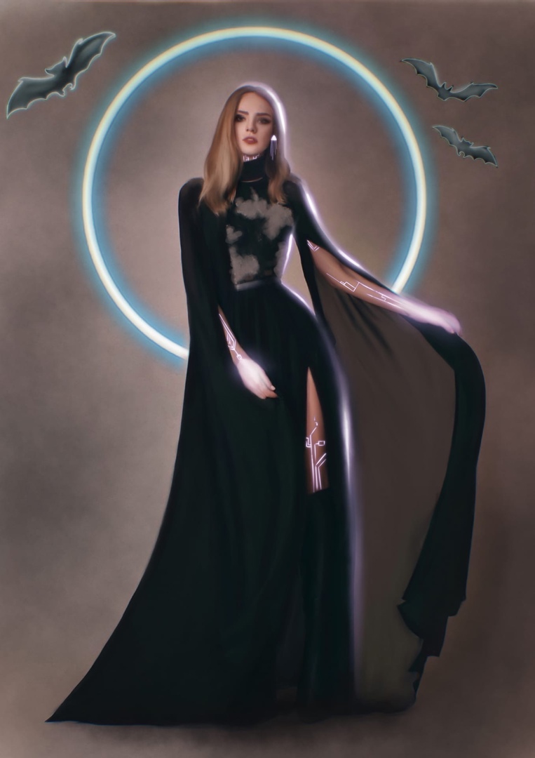 A beautiful dark witch wielding the power of hypnosis and dark entities in the cyberpunk style
