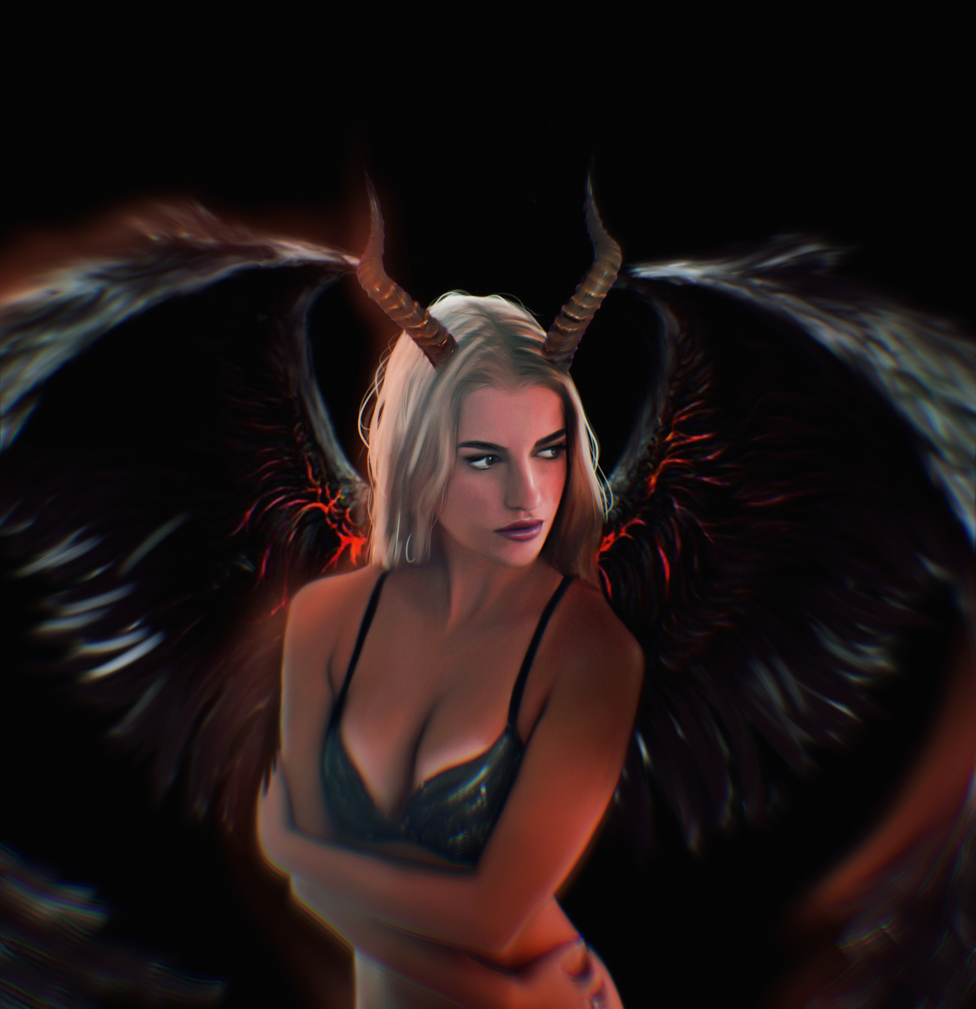 A beautiful sexy demon girl, with huge black demonic wings.