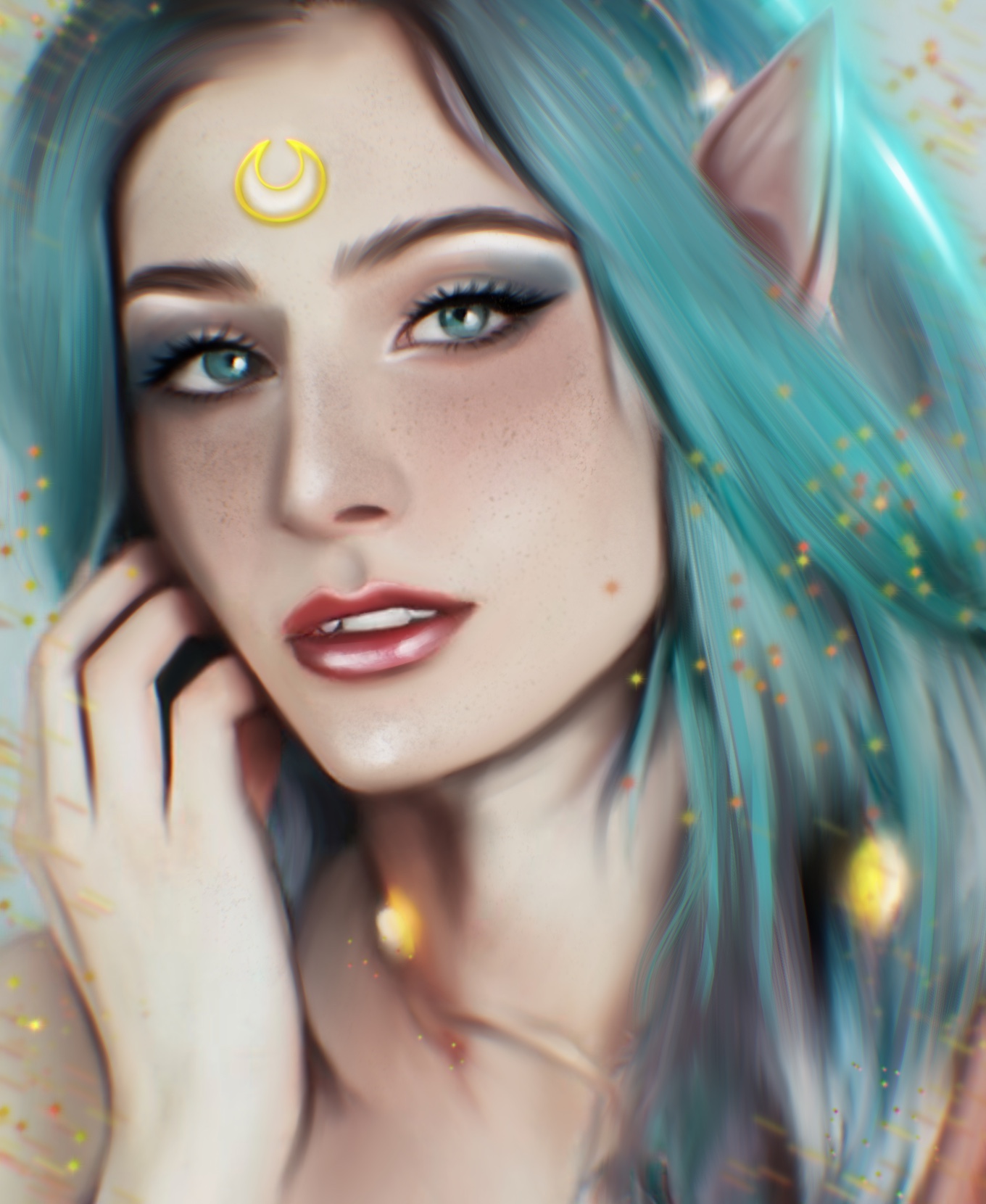 Beautiful moon elven, with beautiful turquoise eyes and hair shimmering with light