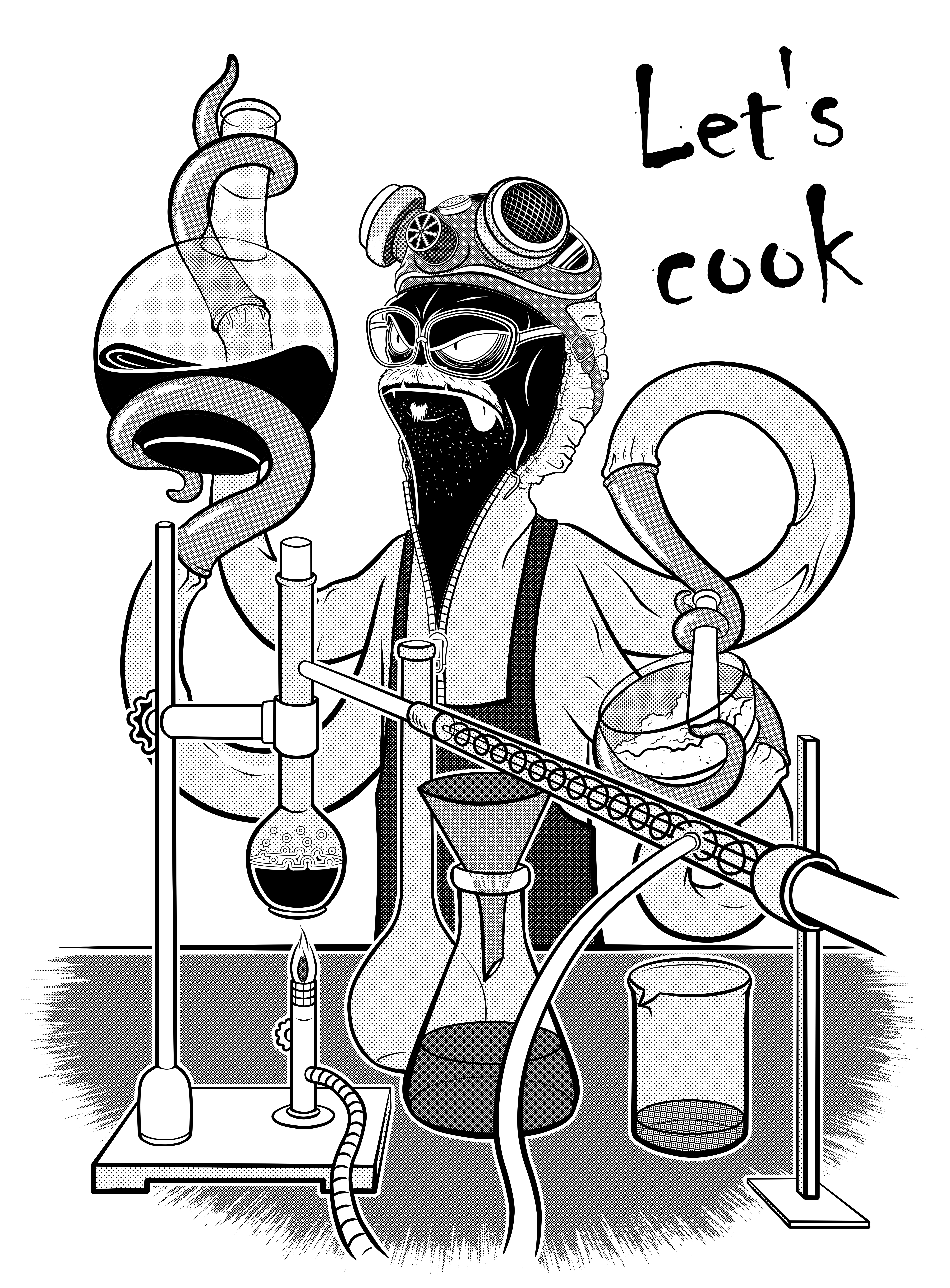 Let's Cook! Line art artwork with original octopus character named "Okta". Parody of my favorite television series. Full black and white with raster tones. PNG 5906x8004px (300dpi, 50 x 68 cm) - print ready.