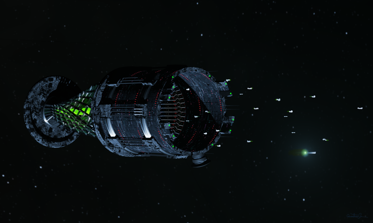 Recently, while helping a buddy with construction work on his house, I was working with a concrete mixer. I threw one shovelful of sand and cement after another into the concrete mixer and I was quickly getting bored with this type of monotonous work. Then I suddenly had a daydream. The concrete mixer became an alien space harbour in my imagination and the grains of sand became spaceships which wanted to dock in the harbour to do business there. So it might well be that my spaceport reminds you a little of a concrete mixer. I modelled the scene in Blender and made a finished picture from it in GIMP. The unlockable file has the original size of 3000x1800 pixels.