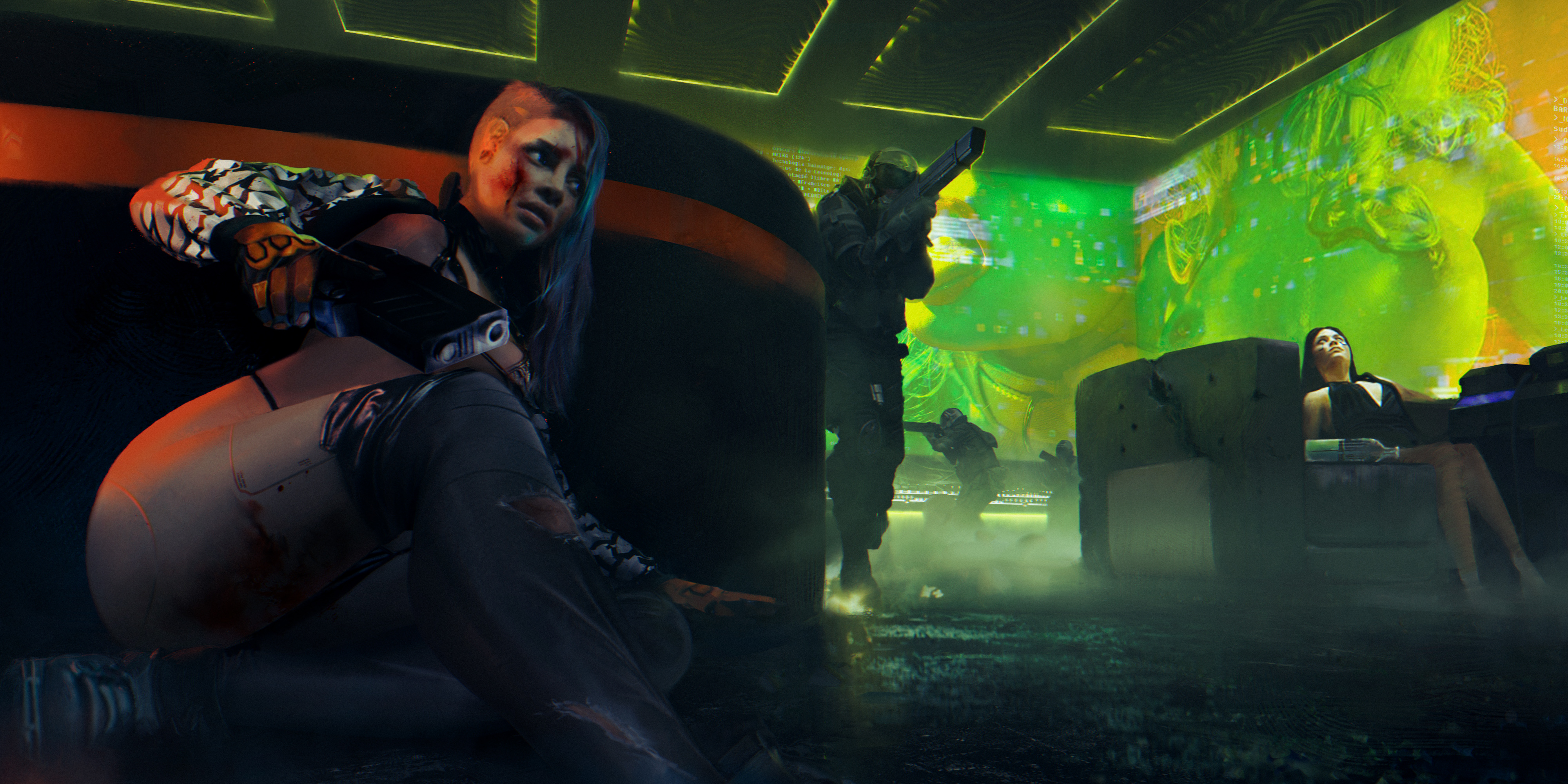 Cyberpunk illustration of a futuristic bar that has been destroyed by special forces, only one survivor will take her chance to make front. This Artwork is a tribute to the cyberpunk 2077 game and dystopian genre. Made with Adobe Photoshop/Blender with Wacom Intuos Tablet. 200+ hours PNG file 4000x2000