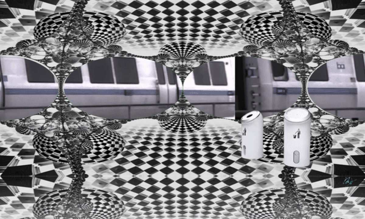 A futuristic train station where a grandiose platform is contrasted with a conventional BART (SF) train. Remix of @elgeko's "checkerboard": https://nftshowroom.com/elgeko/art/elgeko_fractal-beauties_the-grandmasters-checkerboard-4d-time-escape (minted with his permission)