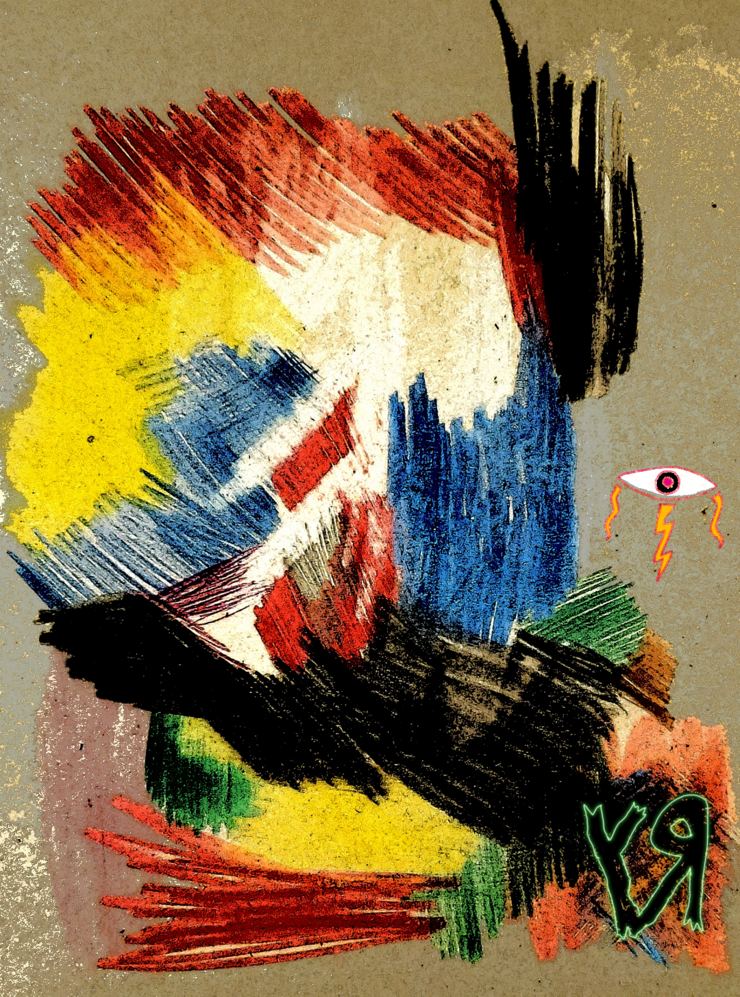 [Crayon, wax pencil, and felt pen on reclaimed cardboard with digital embellishments and color.] Color experiment. Emotional qualities of color and tone. And a flying eyeball shooting lightning, of course... ---Richard F. Yates (Holy Fool)