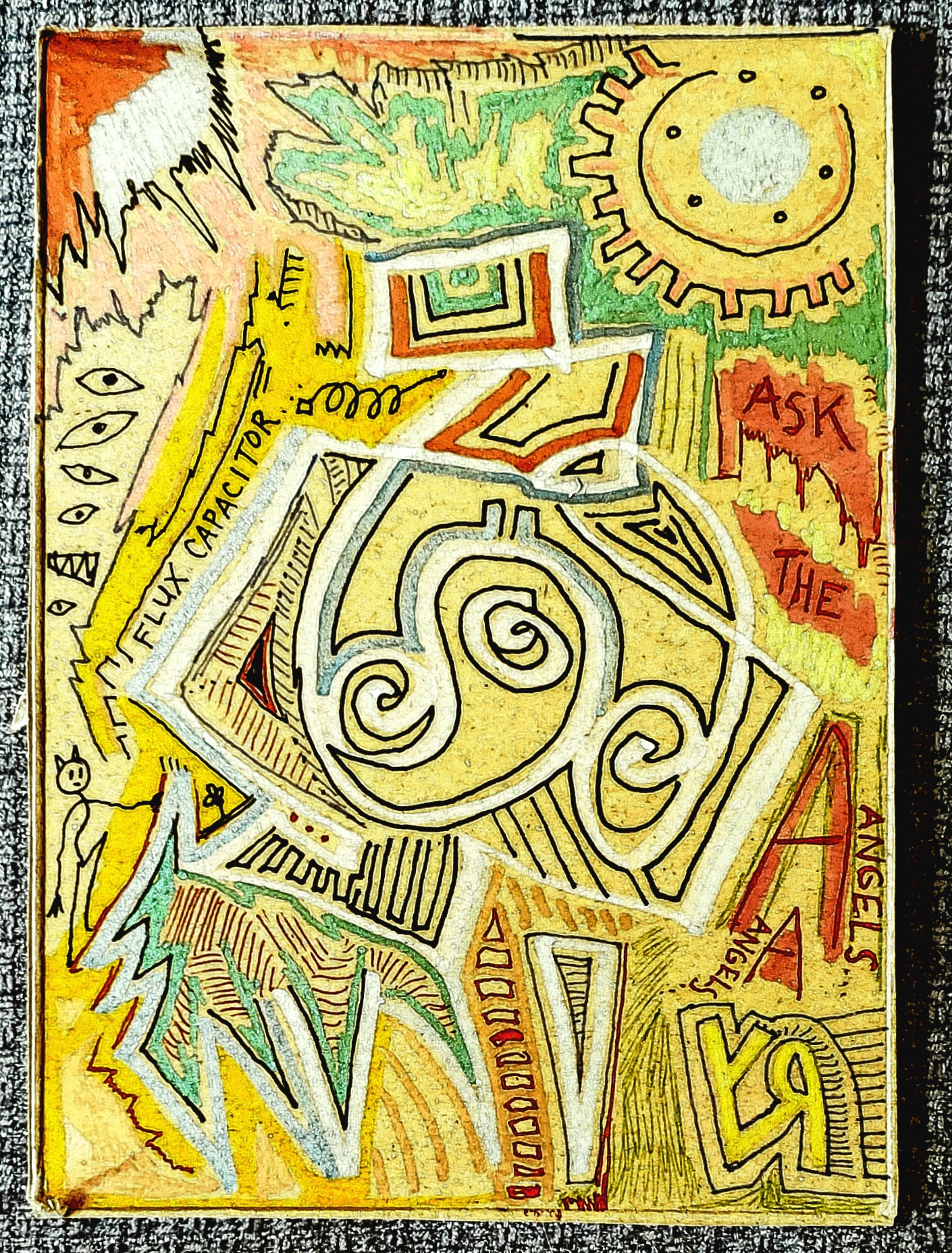 [Various brush pens, metallic markers, paint pens, and liners on reclaimed cardboard with digital embellishments.]