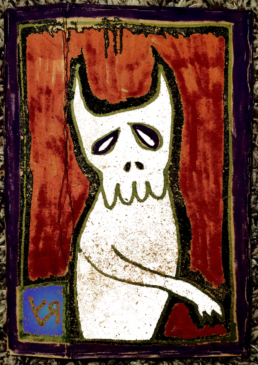 [Brush pen and felt pen on reclaimed cardboard with digital embellishments and color.] Claudio is a spooky specter. Some have said that ghosts are the spirits of dead folks who are stuck here in the human realm (at least partially.) We don't think so. We think ghosts are something OTHER... Very, very other...