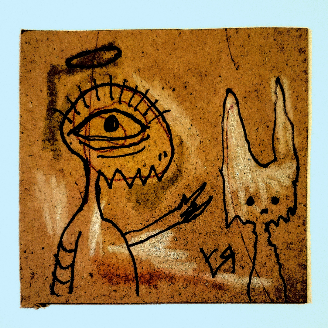 [Sharpie, crayon, and ink on reclaimed cardboard with digital embellishments and color.]