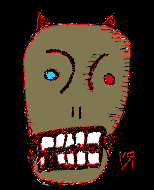[Crayon and red gel pen on reclaimed cardboard with digital embellishments and color.]